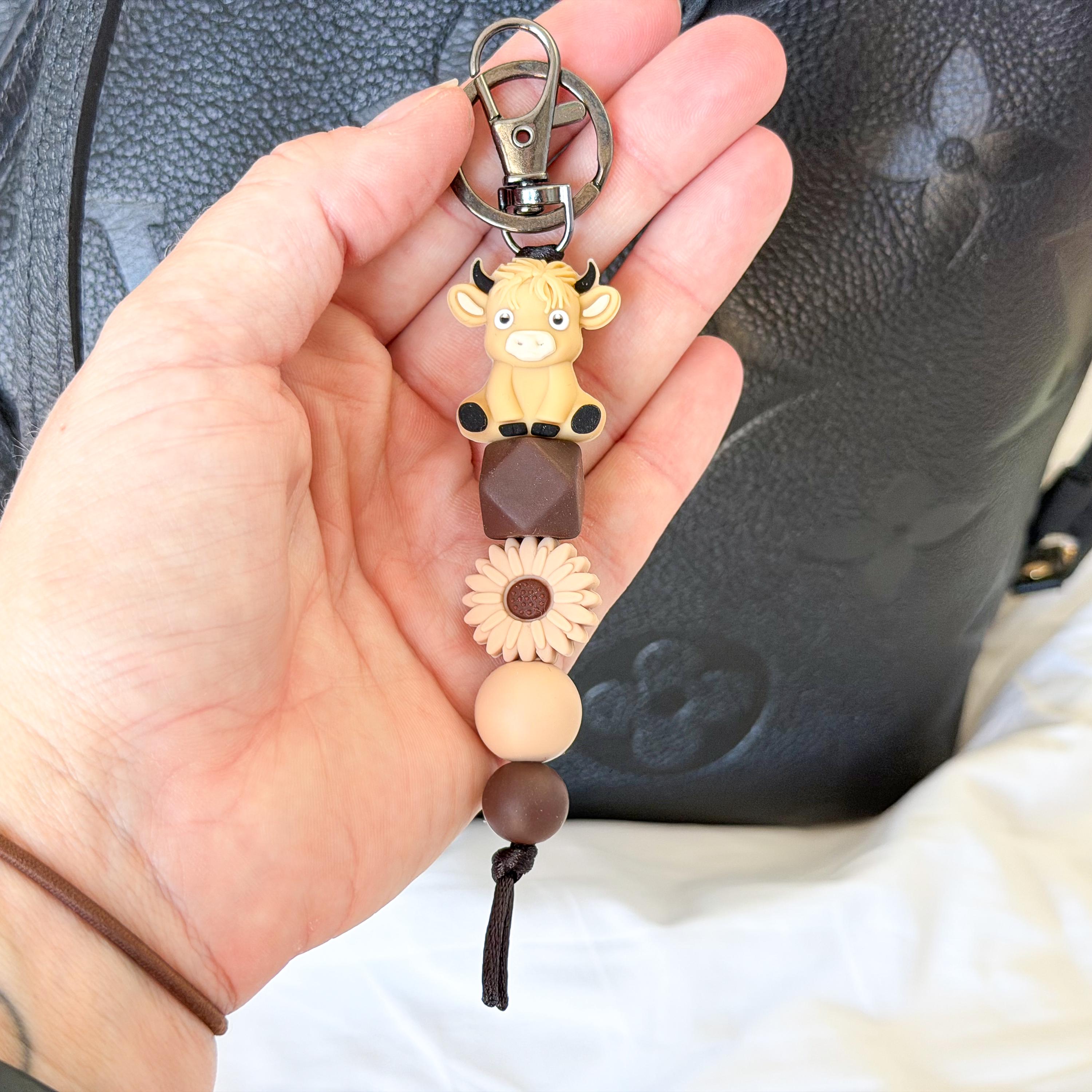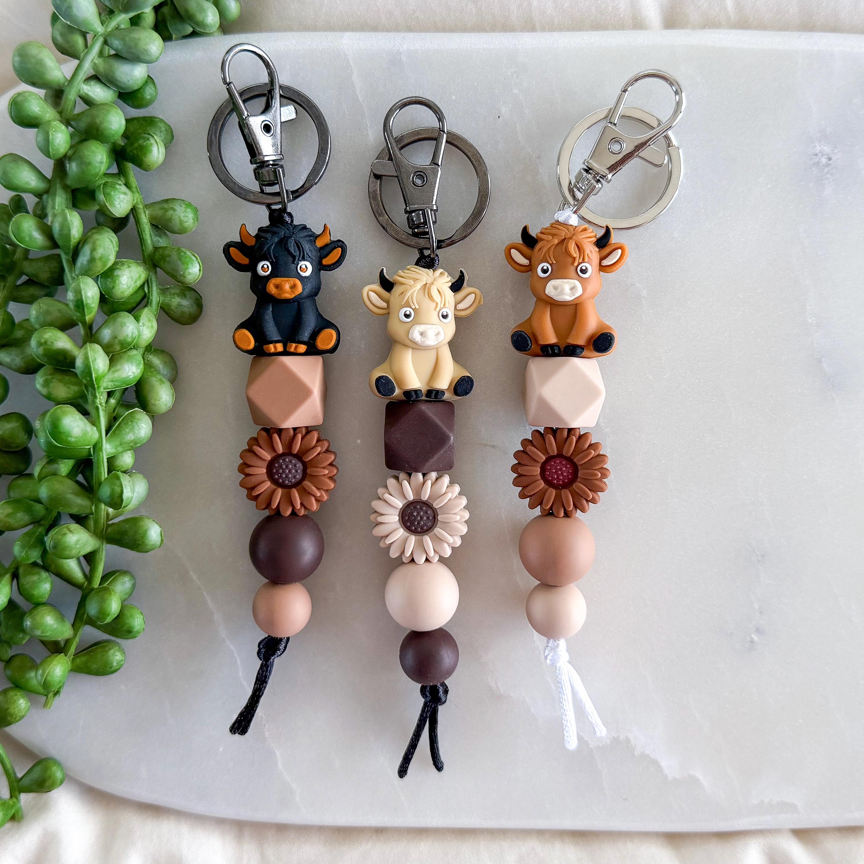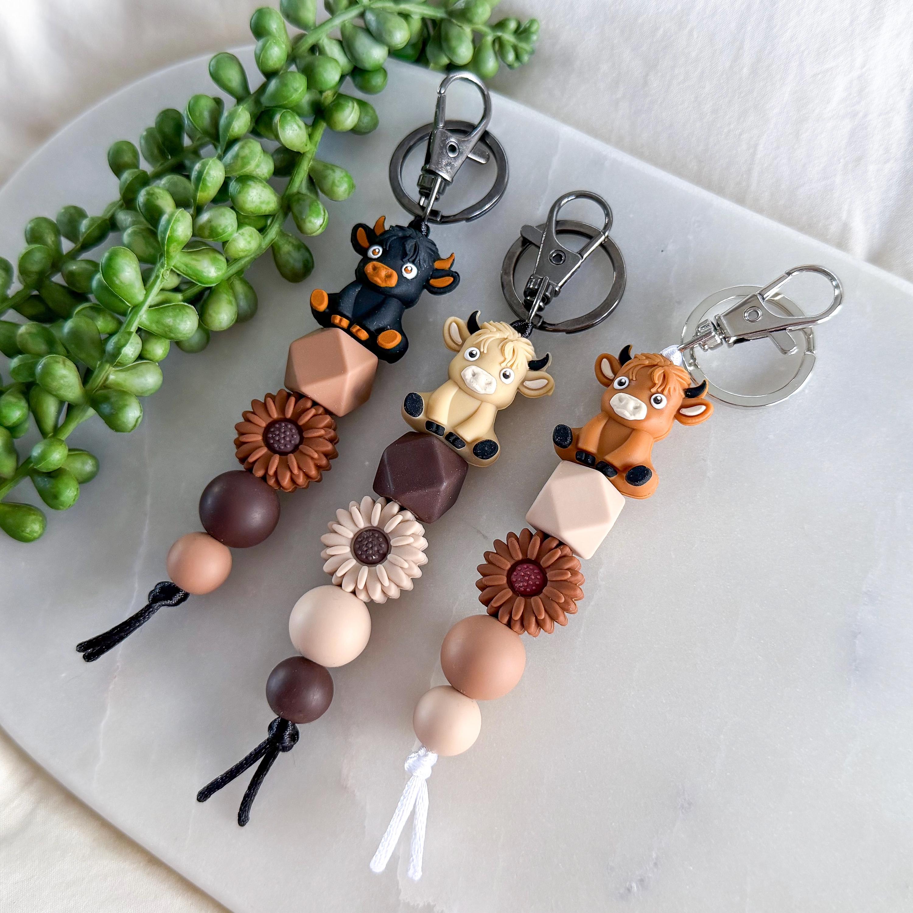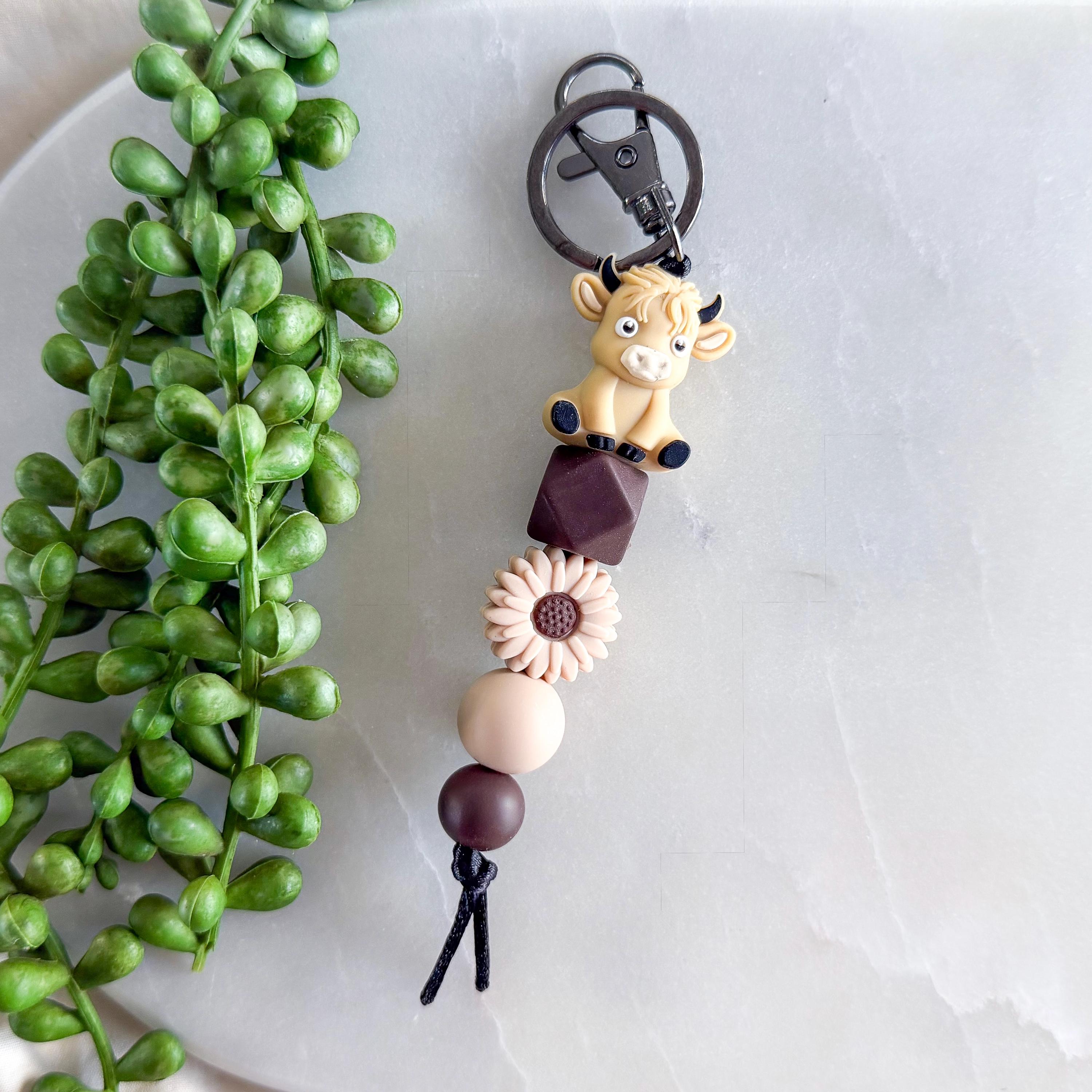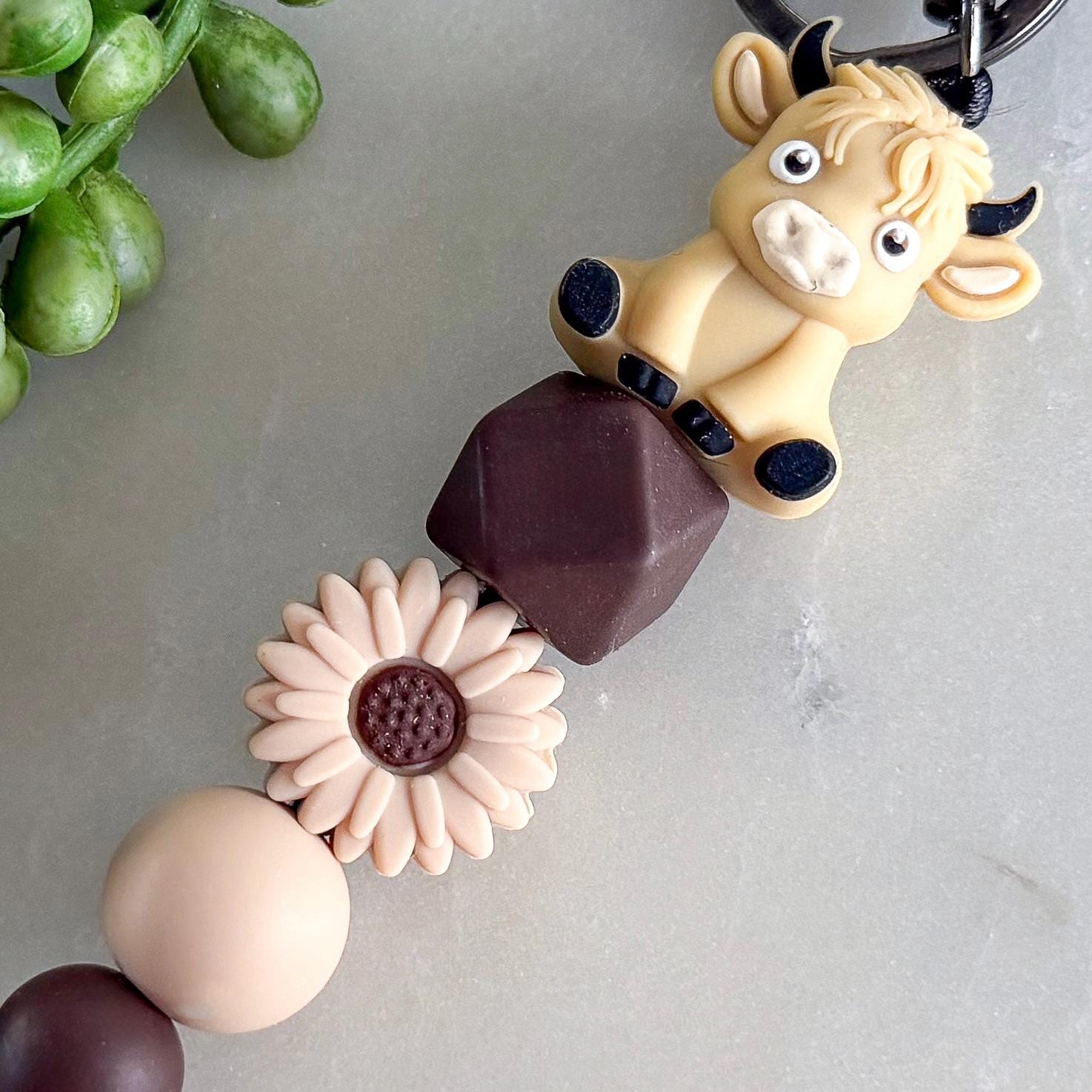A sweet little moo-inspired silicone bead keyring, featuring soft neutral tones and the cutest cow detail.