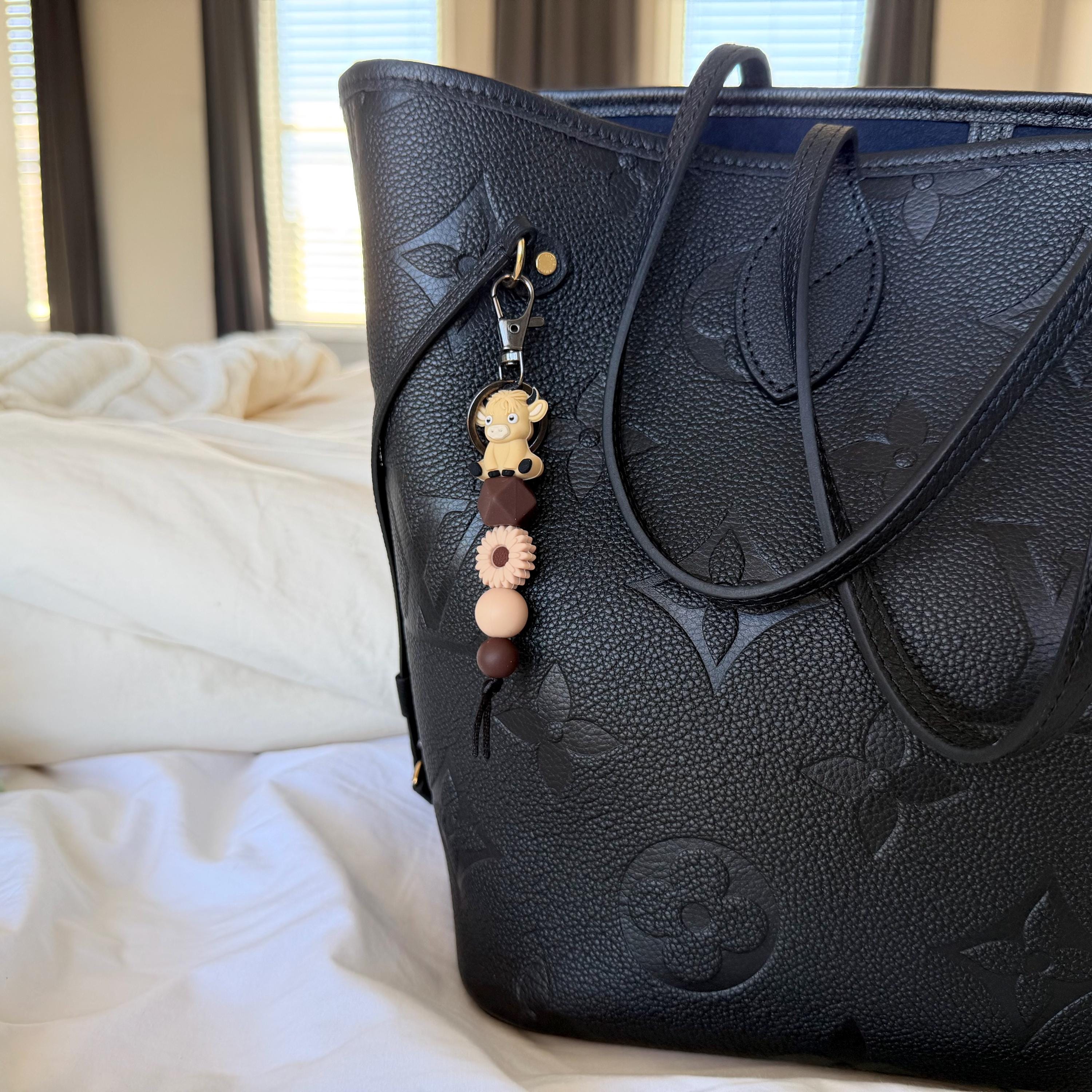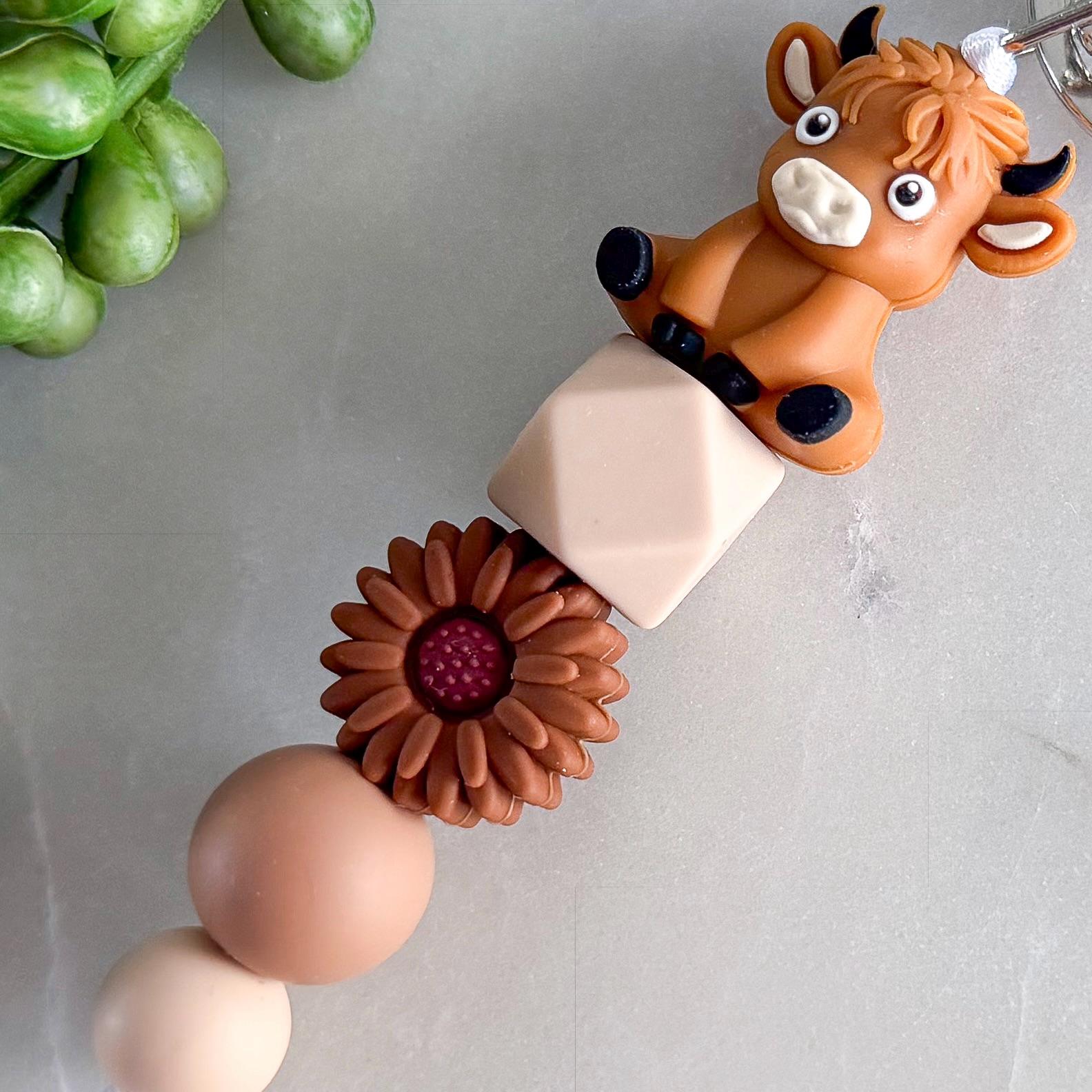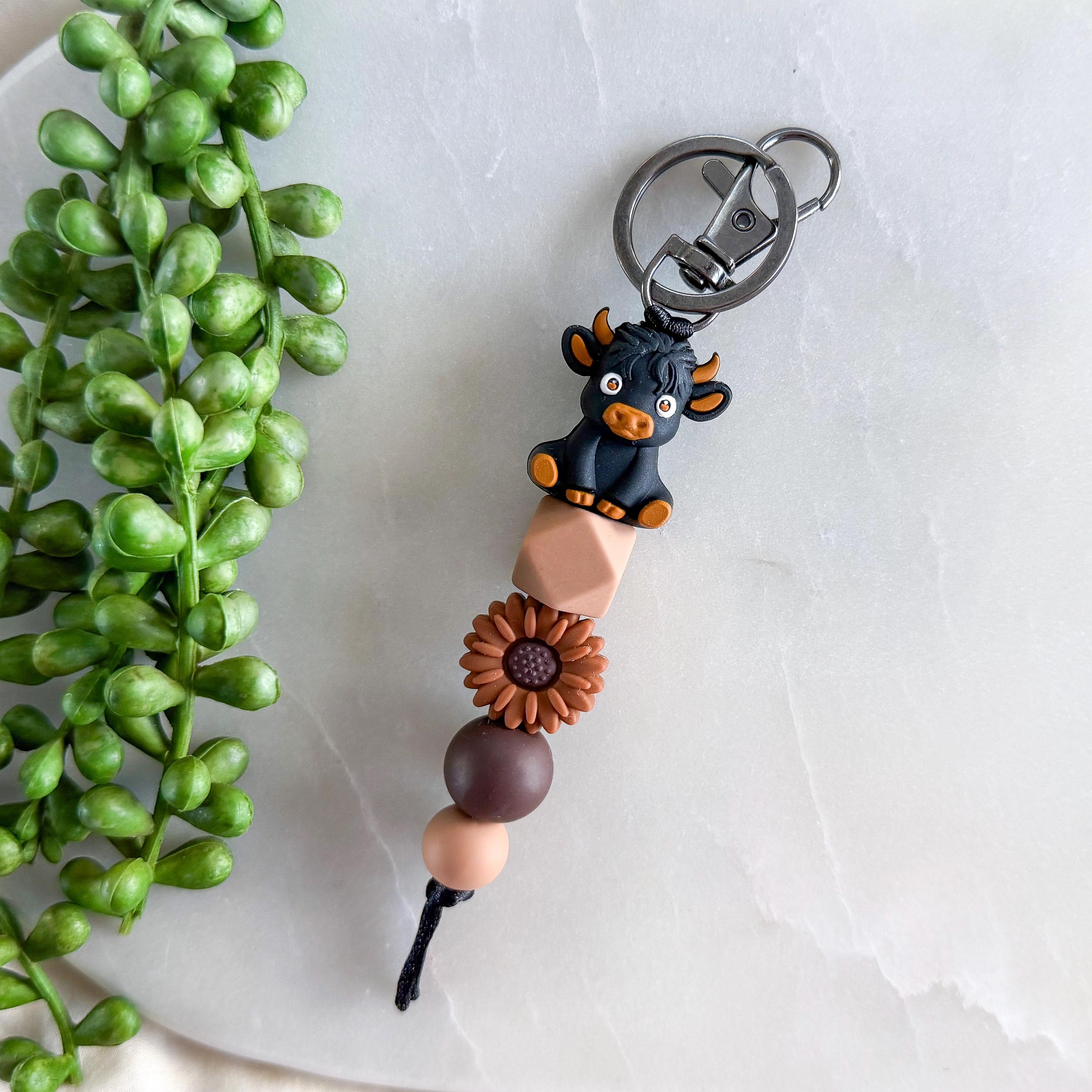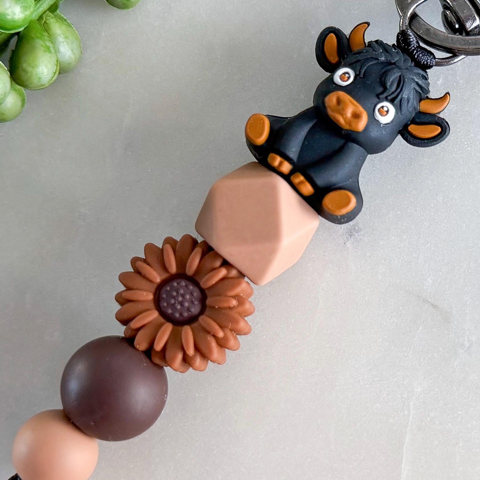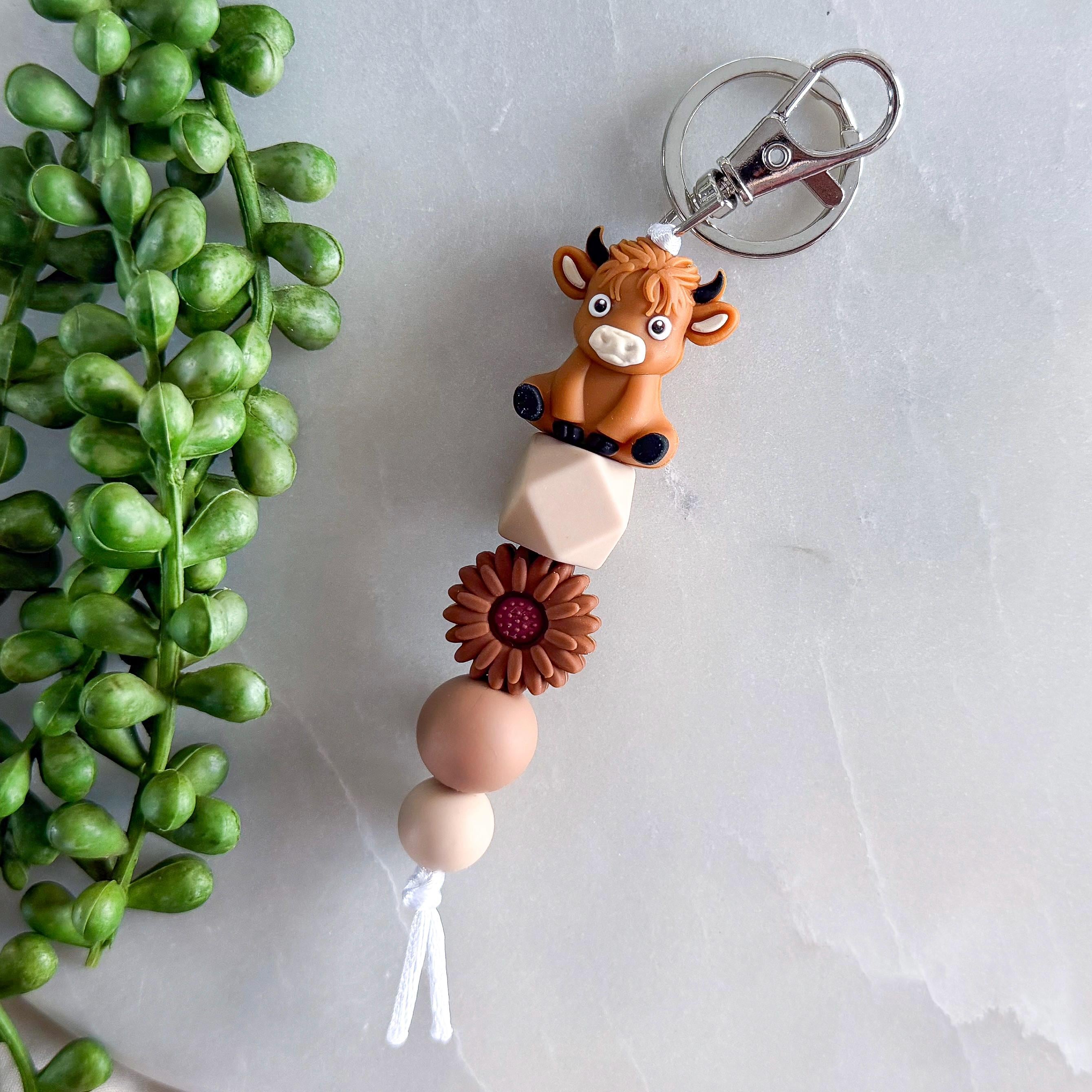 A sweet little moo-inspired silicone bead keyring, featuring soft neutral tones and the cutest cow detail.