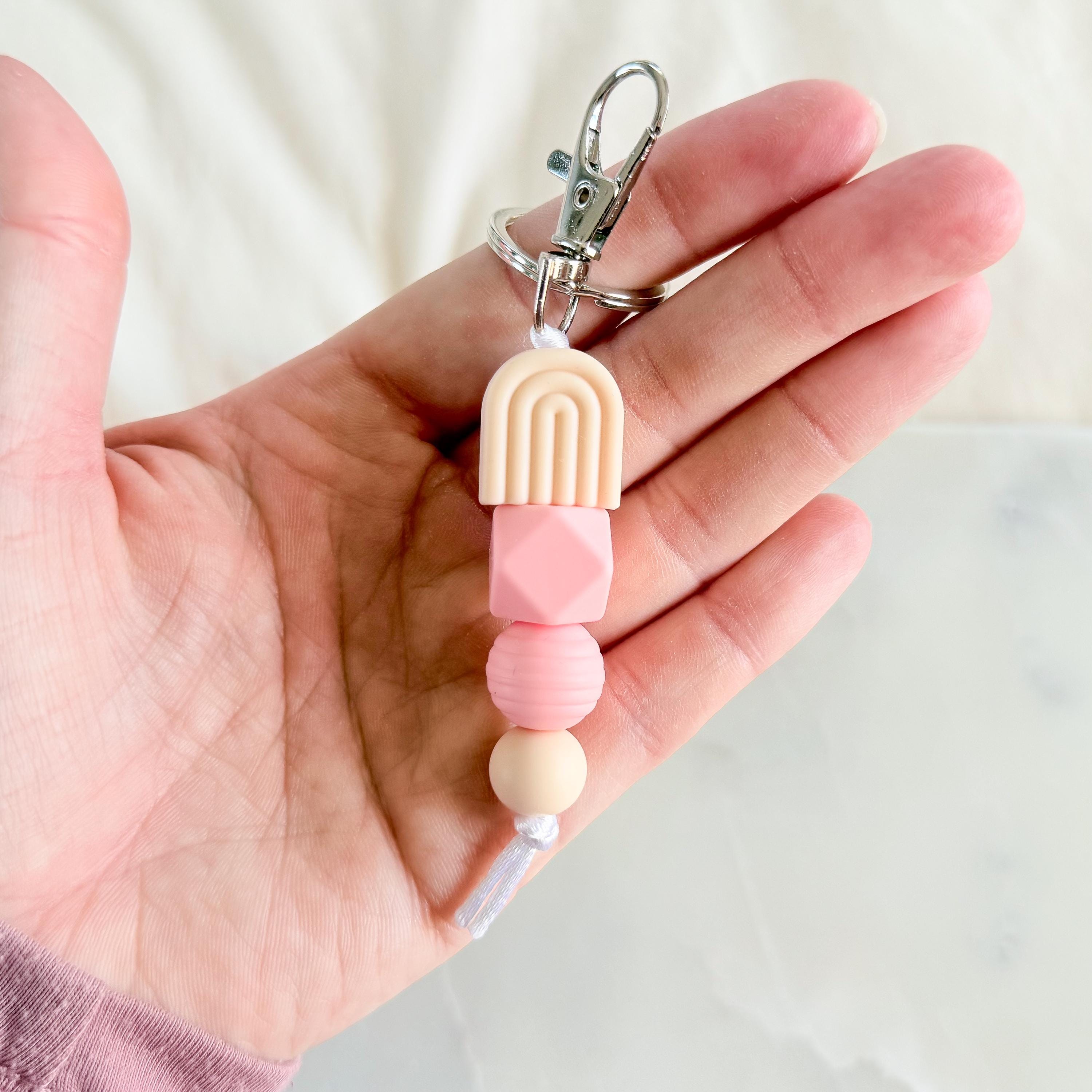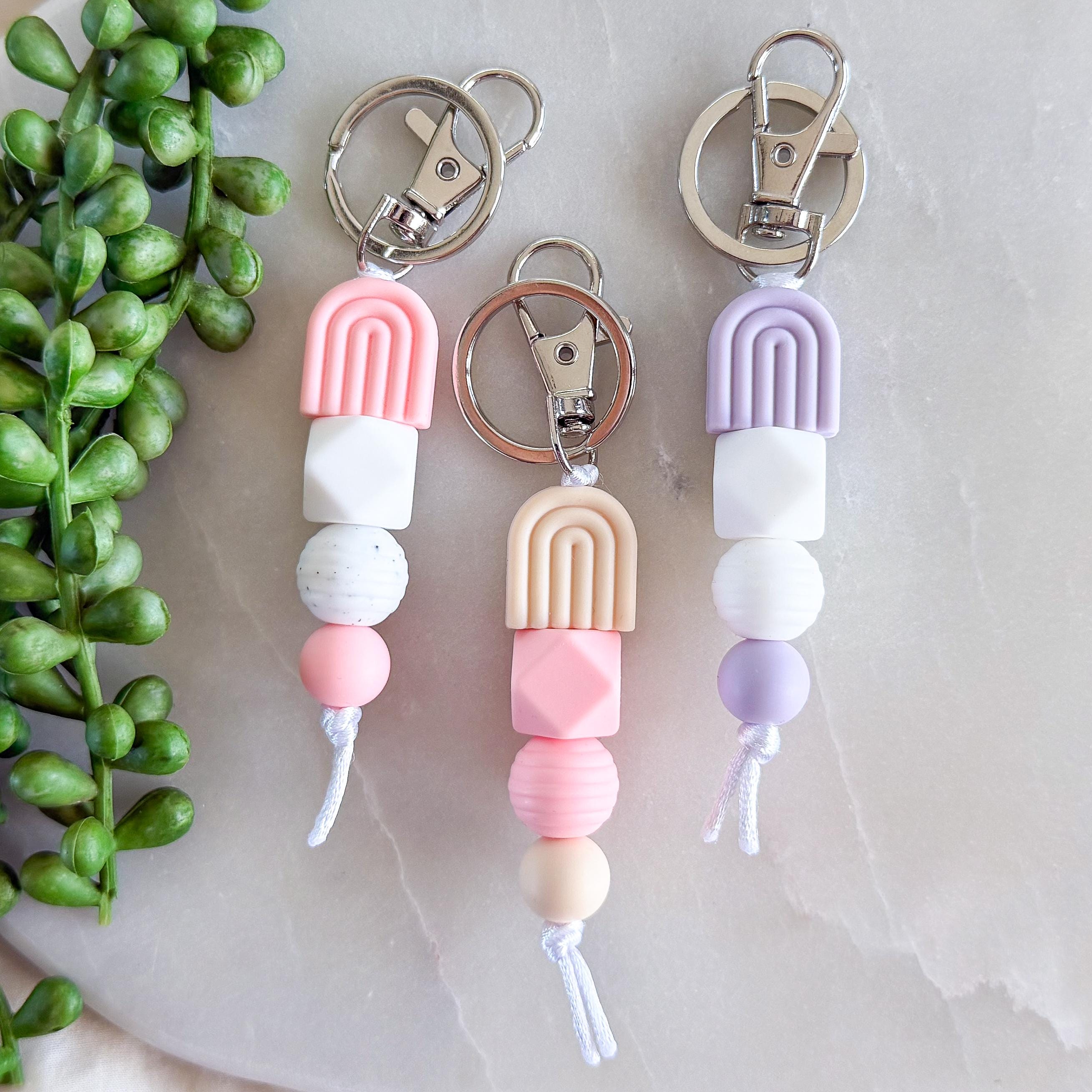 A soft pastel rainbow silicone bead keyring, designed in dreamy neutral tones for the sweetest everyday accessory.