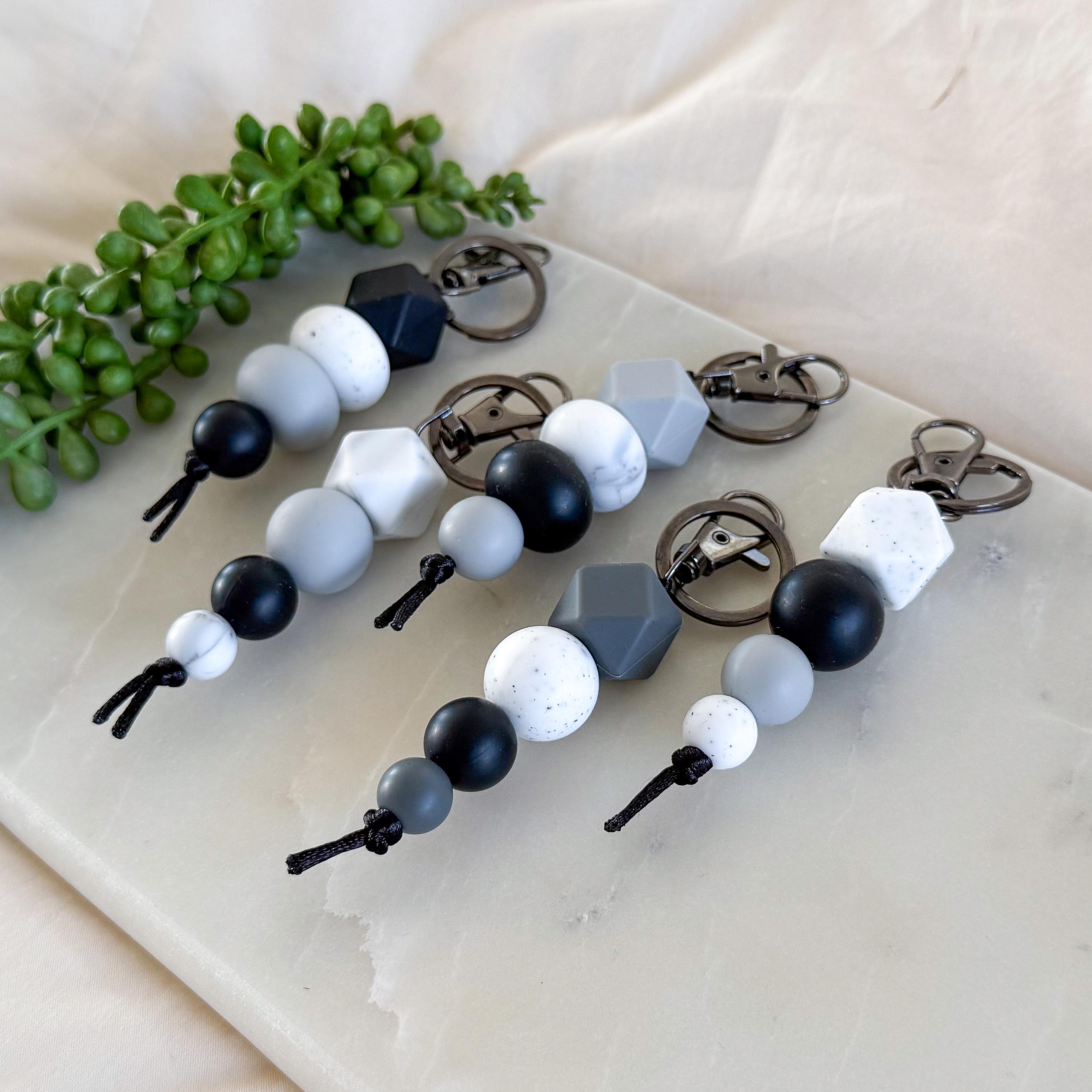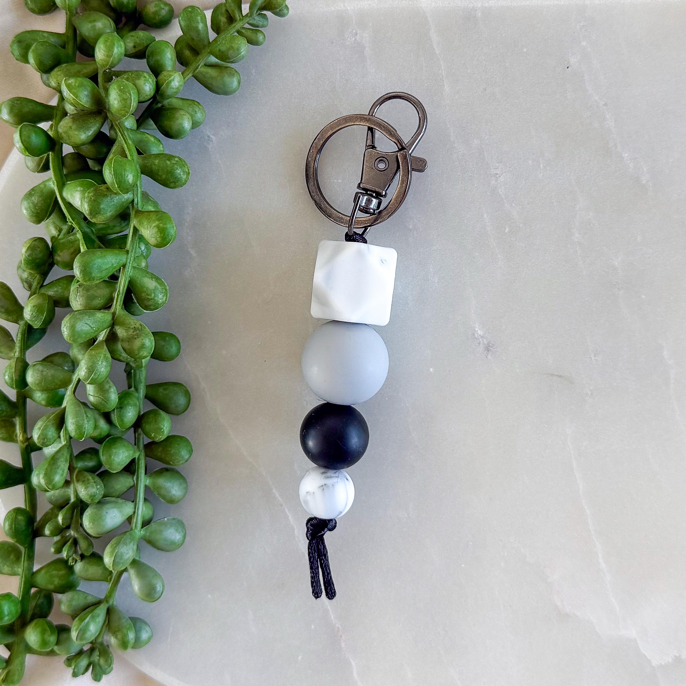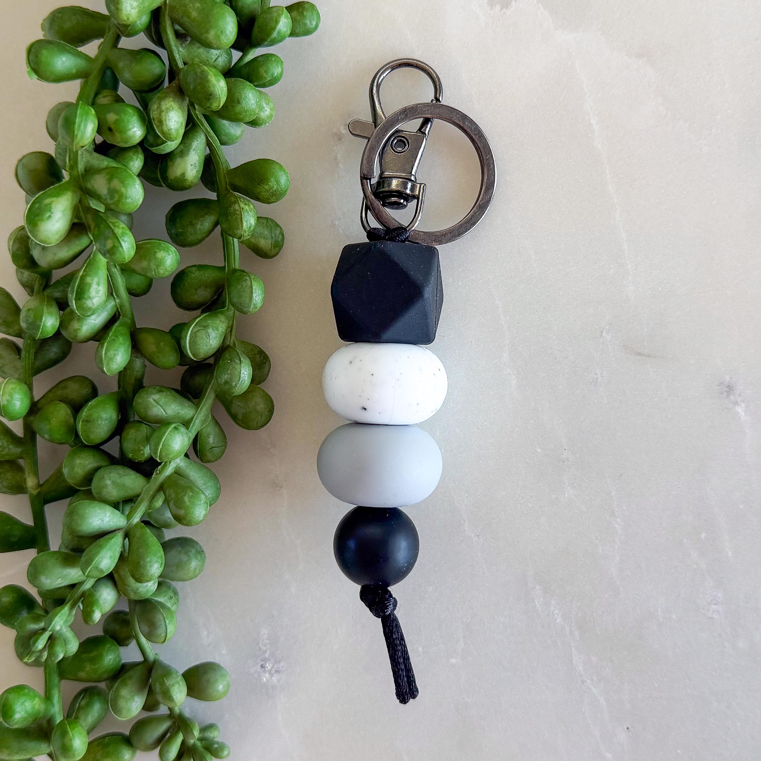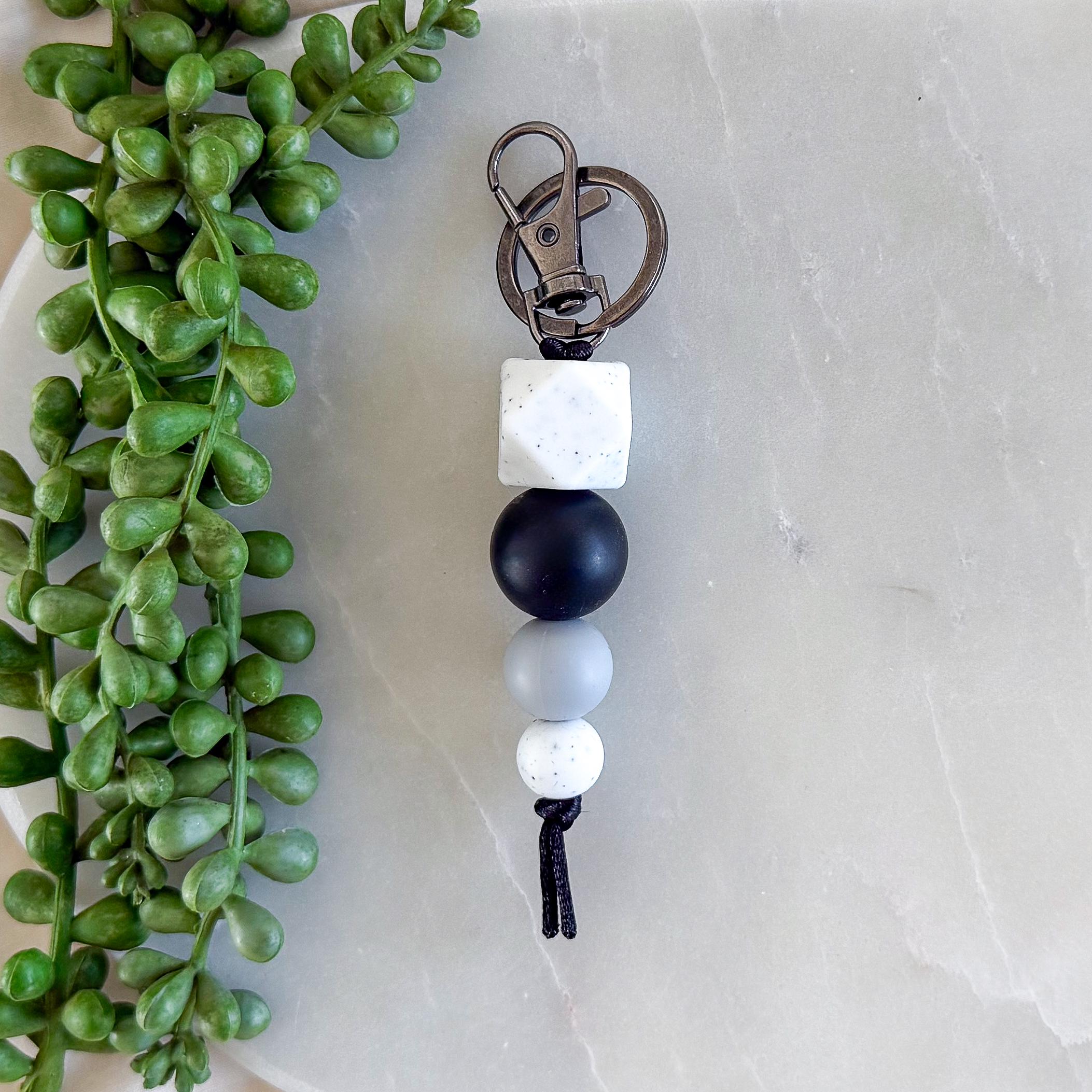Designed with a striking mix of matte black, soft greys, and speckled white beads, this piece is effortlessly cool and endlessly versatile. The neutral tones make it the perfect accessory to pair with any bag, keys, or everyday carry.