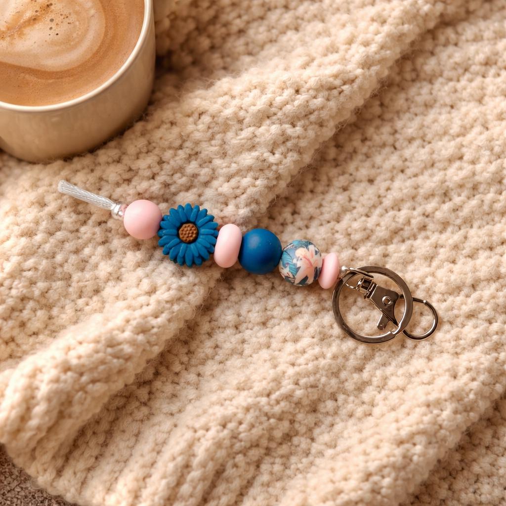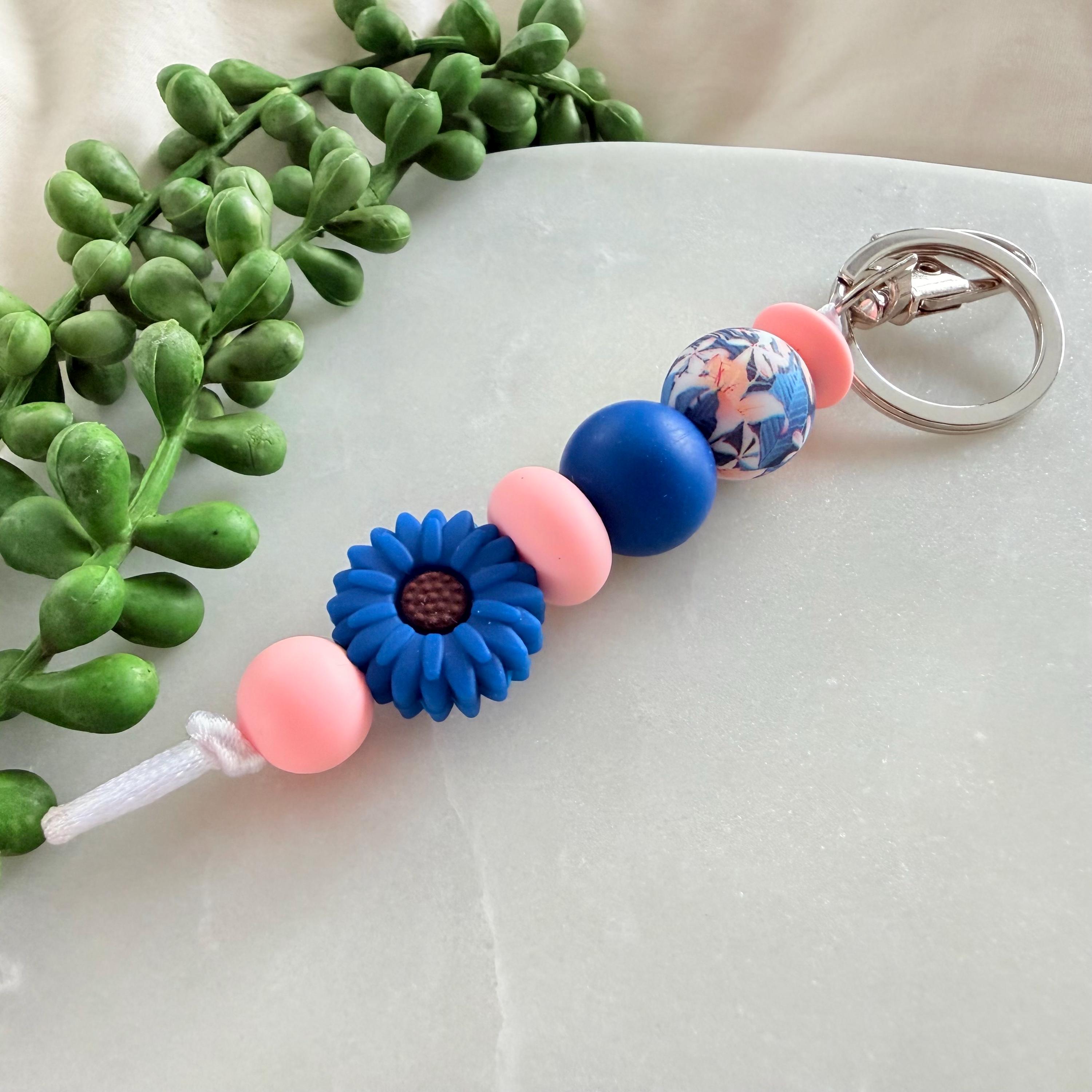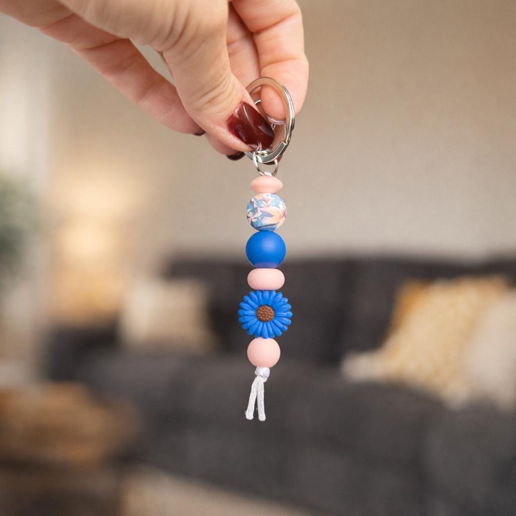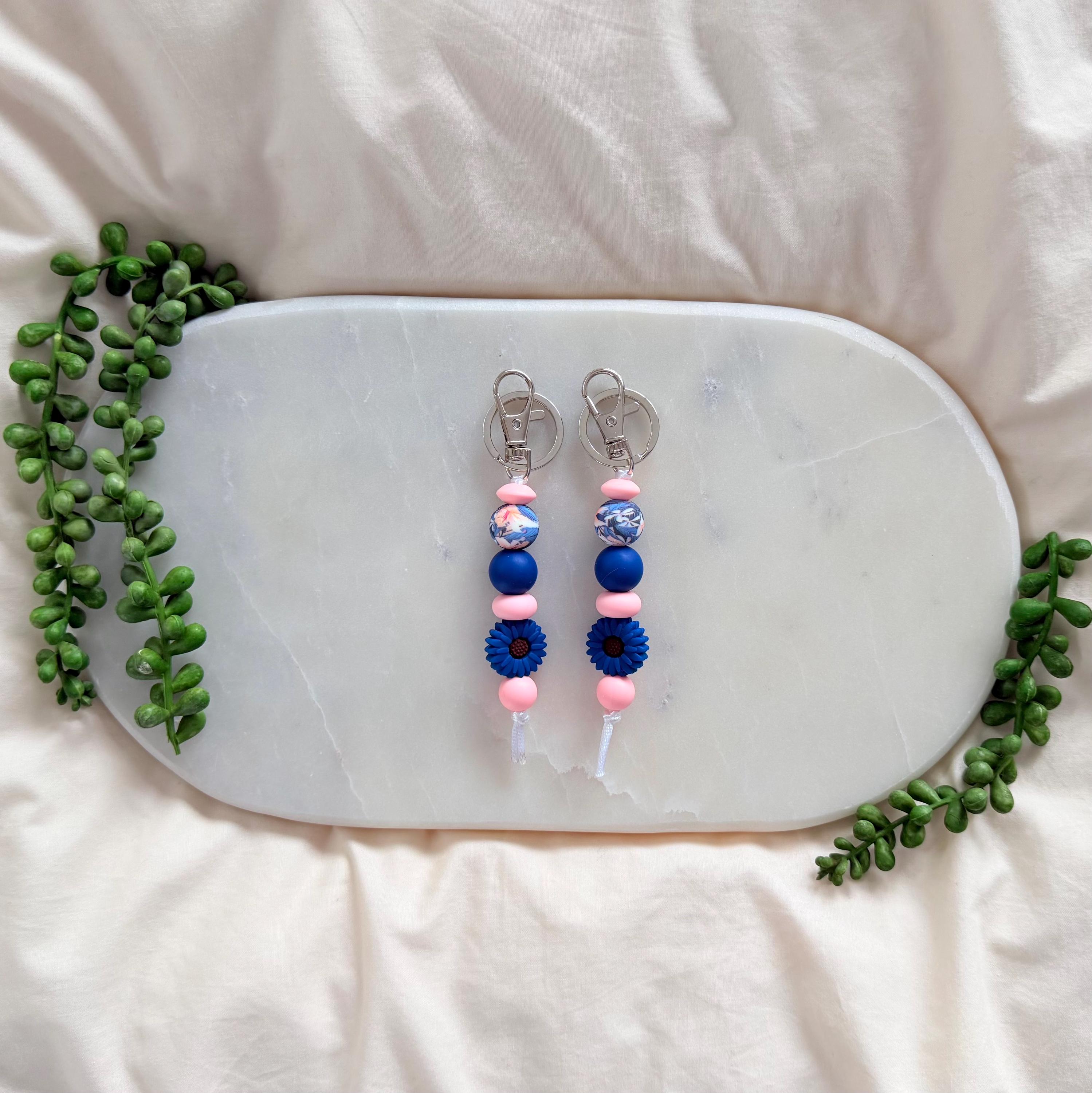 This handmade silicone bead keyring features a dreamy mix of blush pink and deep navy tones, finished with a delicate blue daisy charm. Itโs one of those small things that just feels nice to have - easy to grab, easy to love, and a subtle pop of colour in your day.
