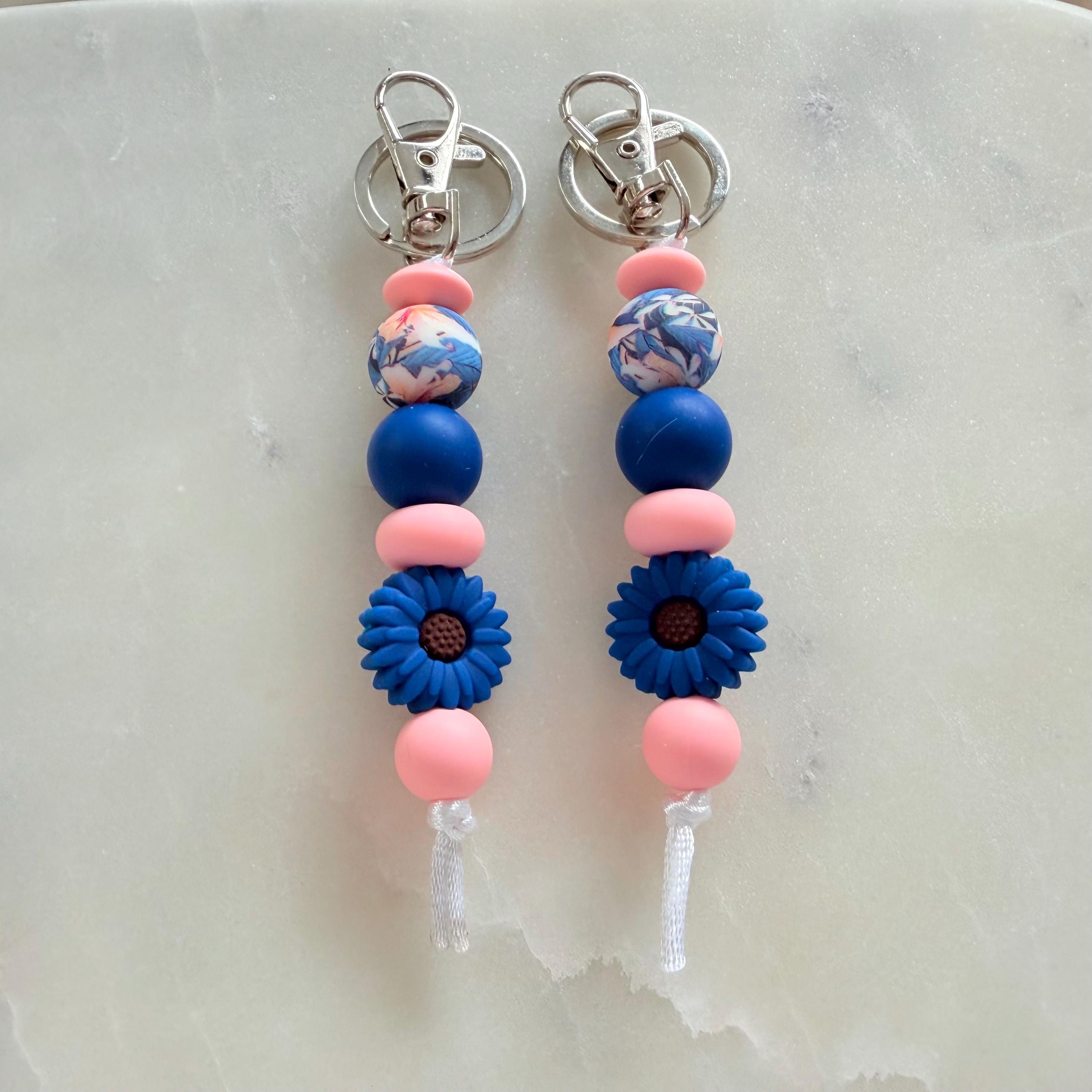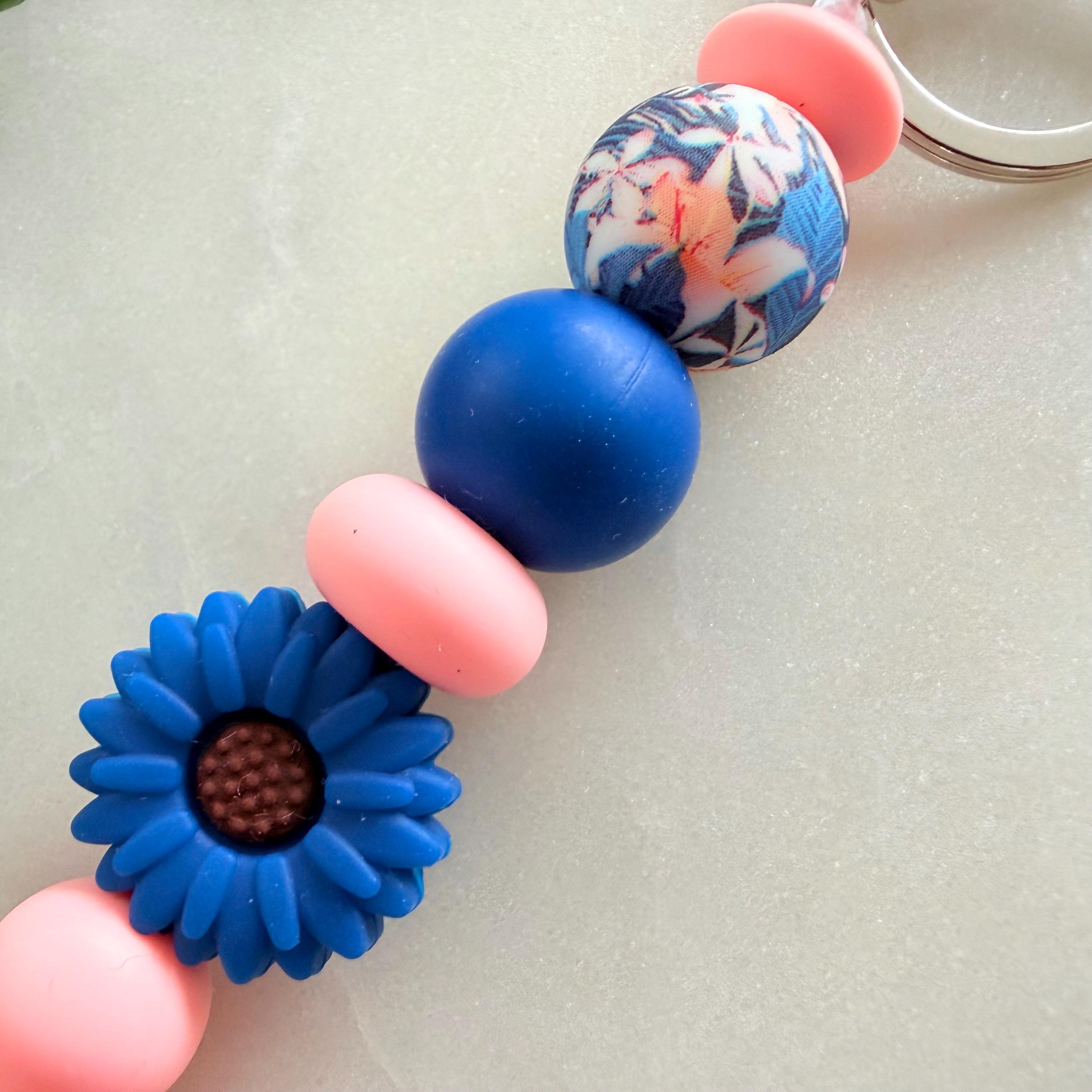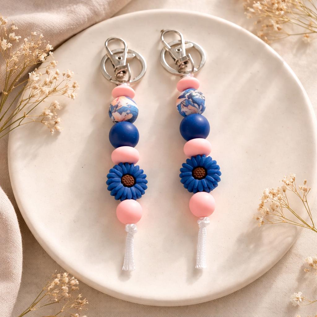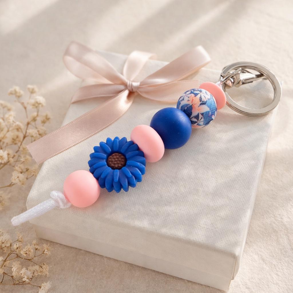 This handmade silicone bead keyring features a dreamy mix of blush pink and deep navy tones, finished with a delicate blue daisy charm. Itโs one of those small things that just feels nice to have - easy to grab, easy to love, and a subtle pop of colour in your day.