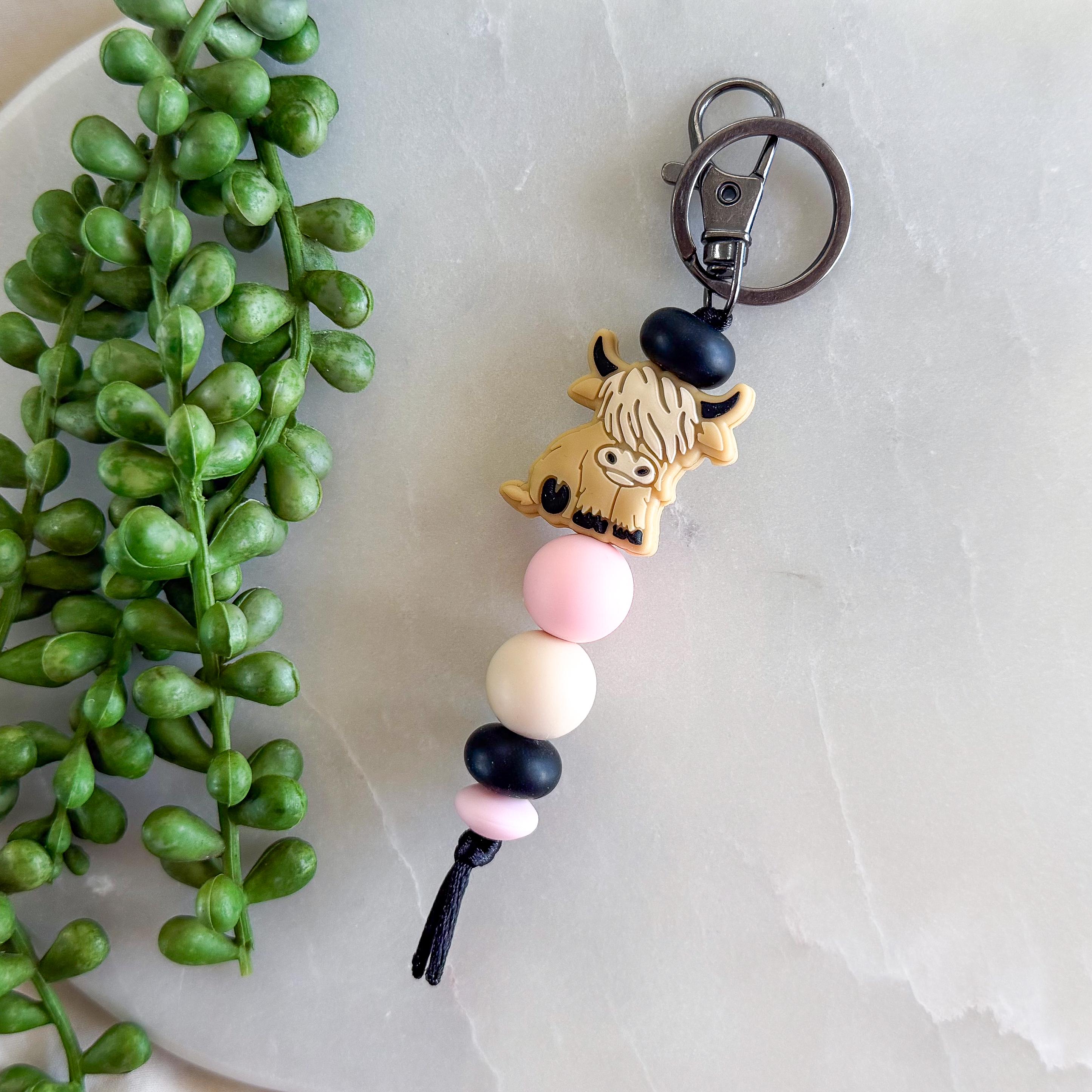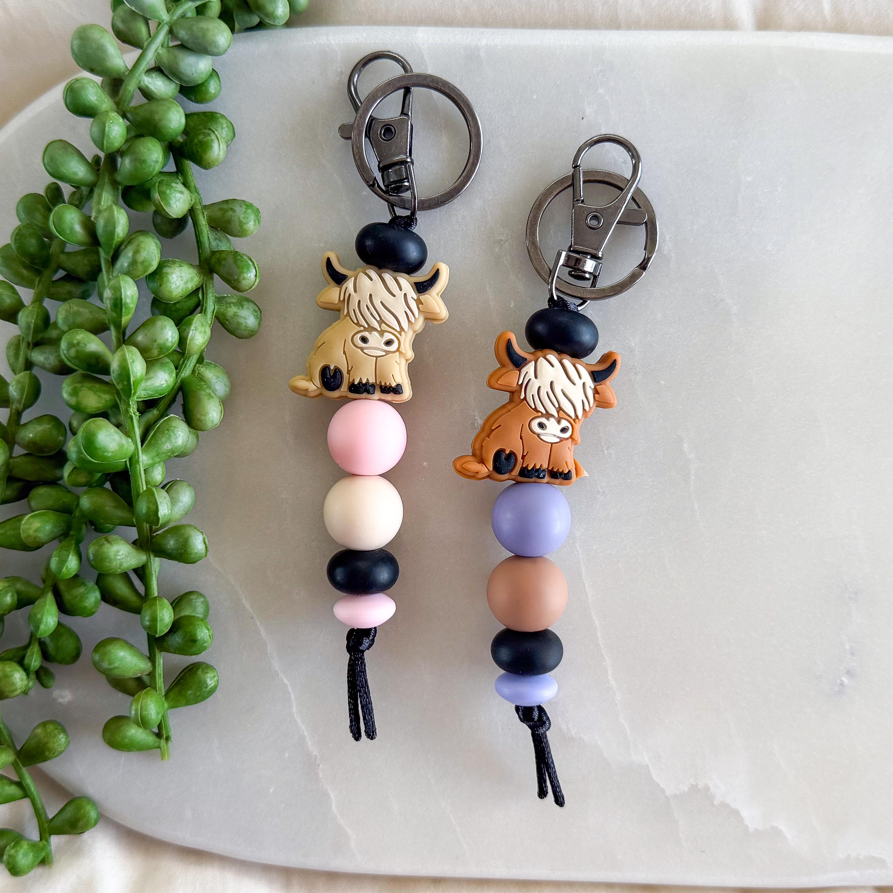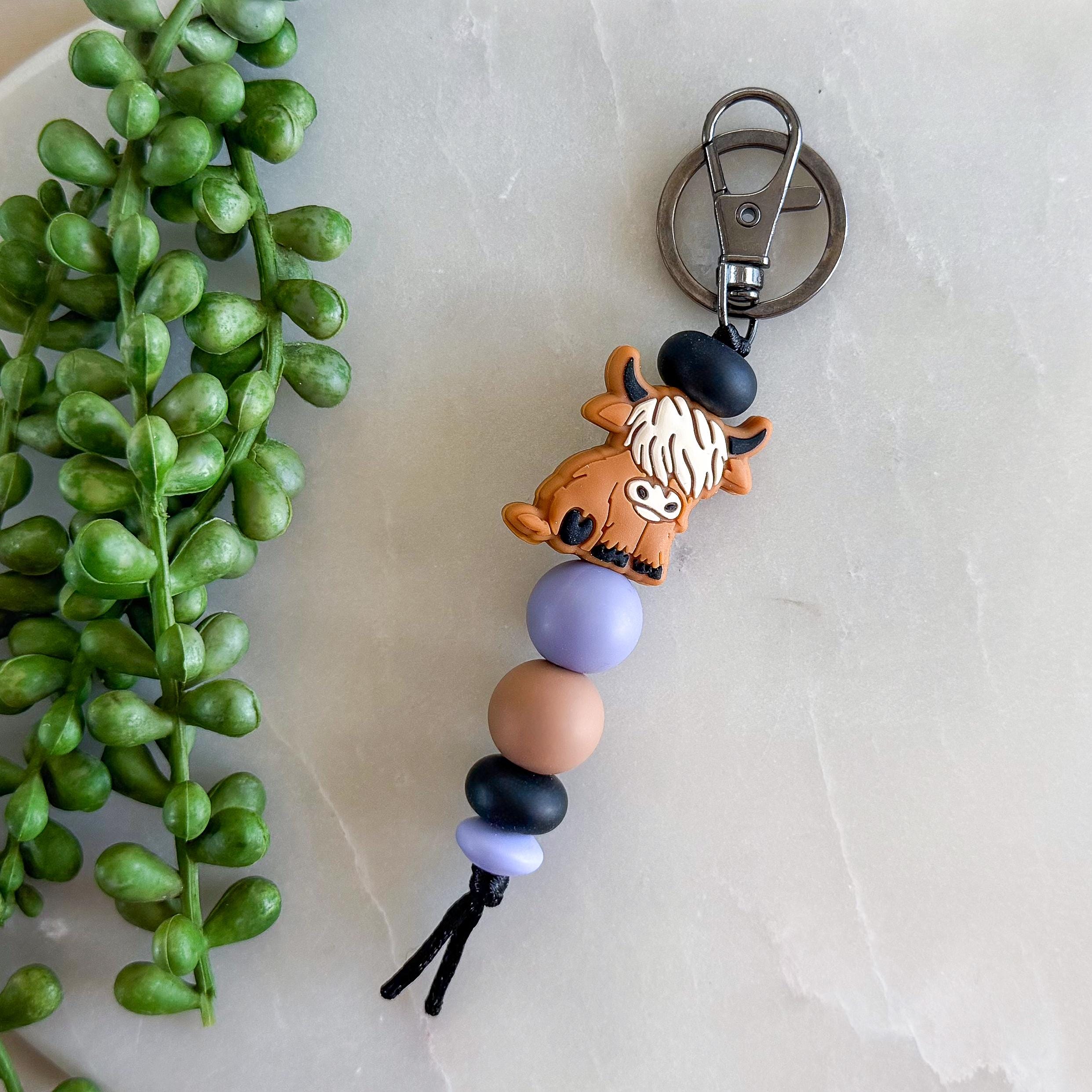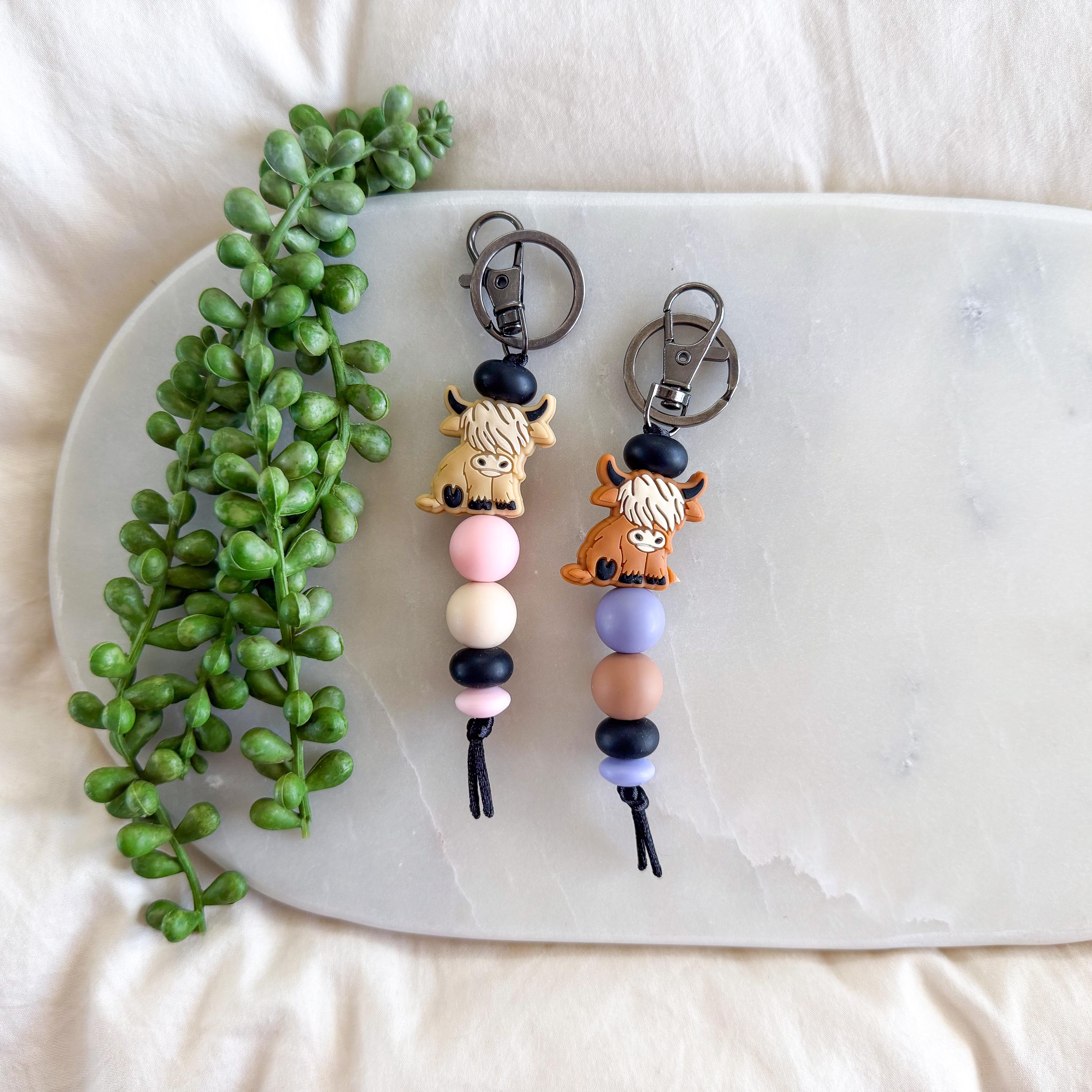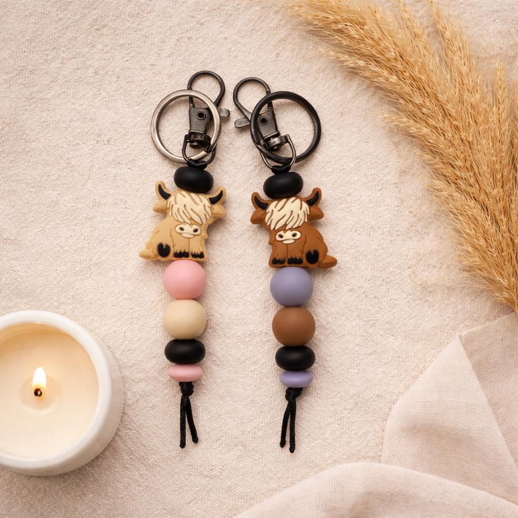 A cosy cow silicone bead keyring in warm, earthy tones - the perfect mix of neutral and playful.