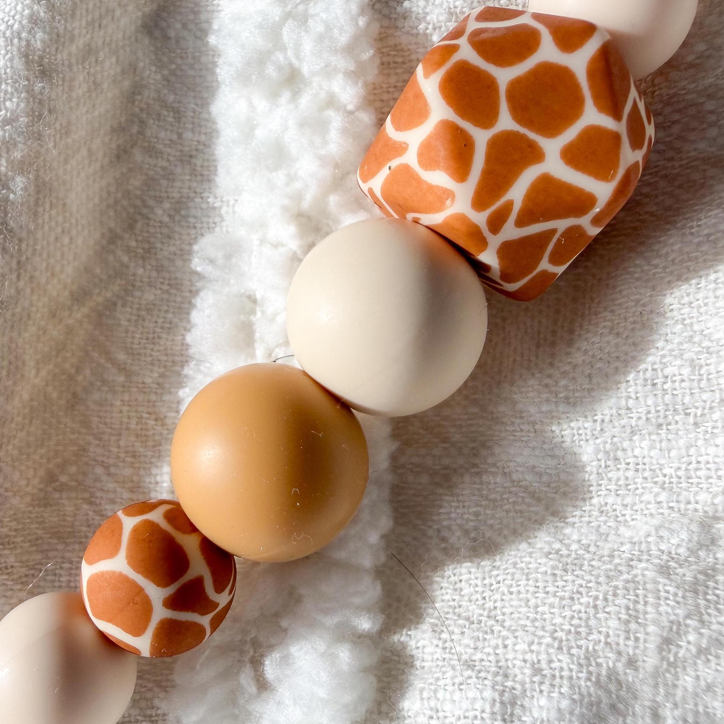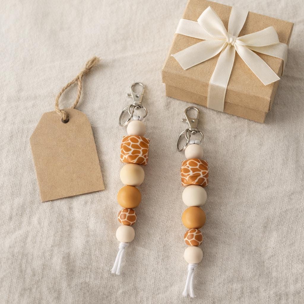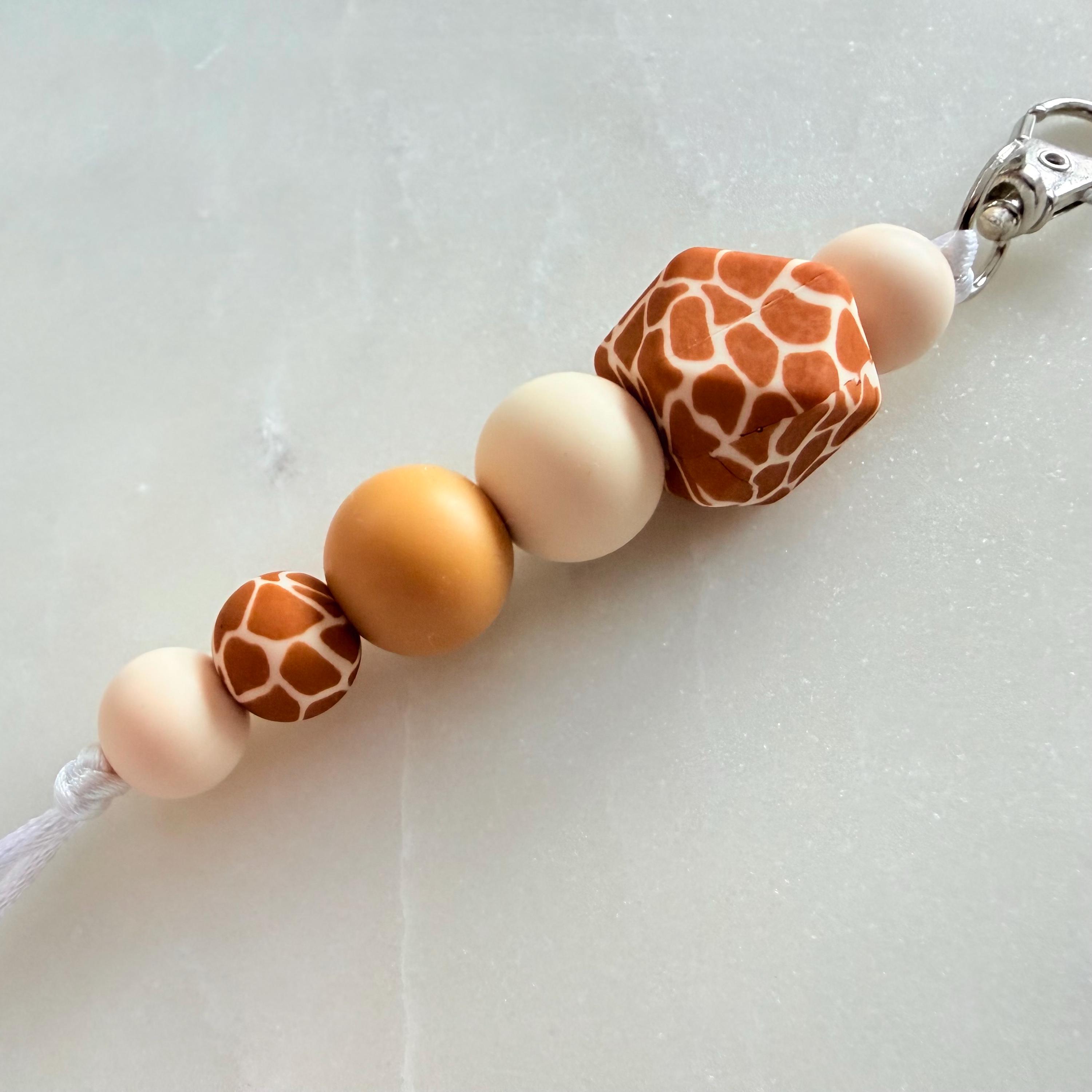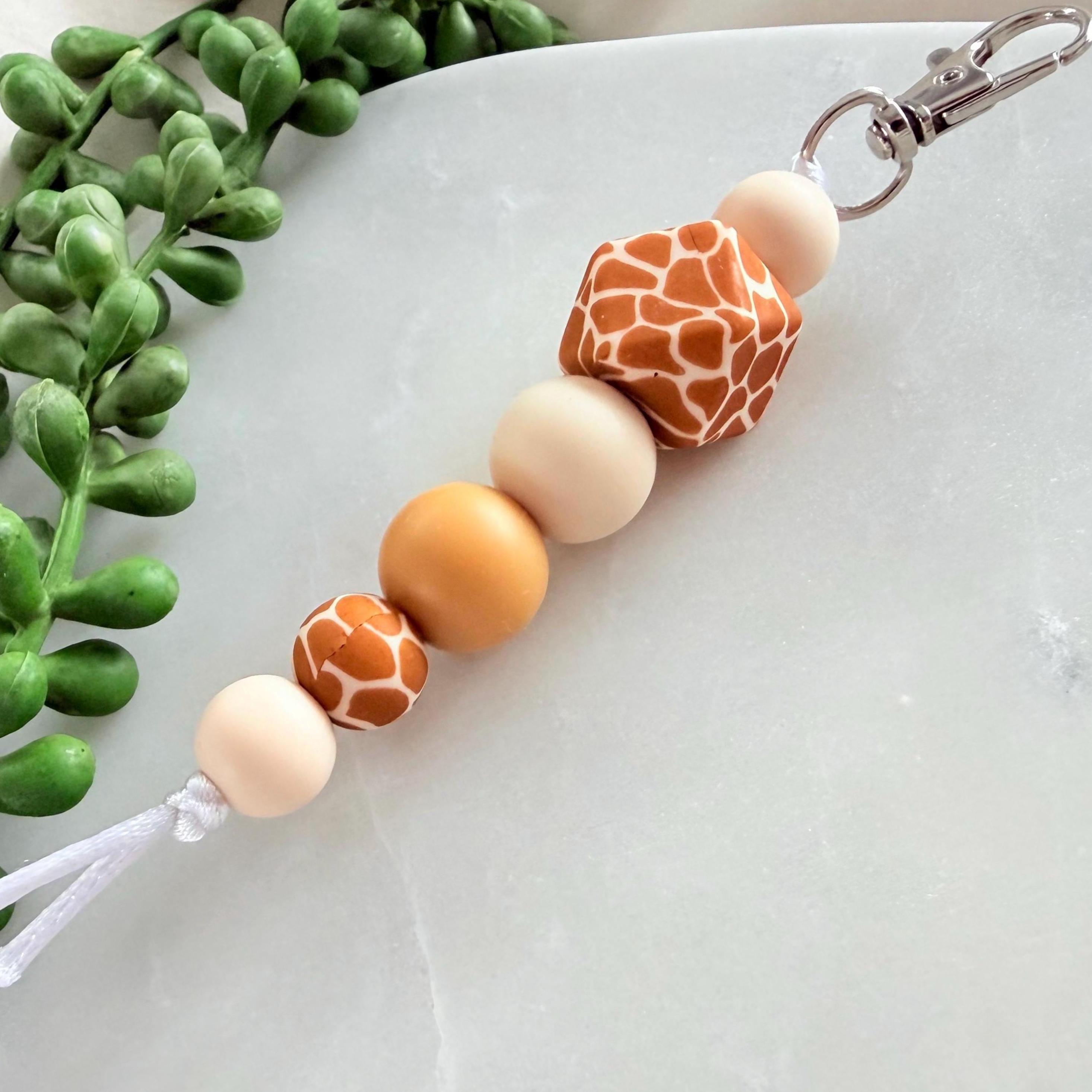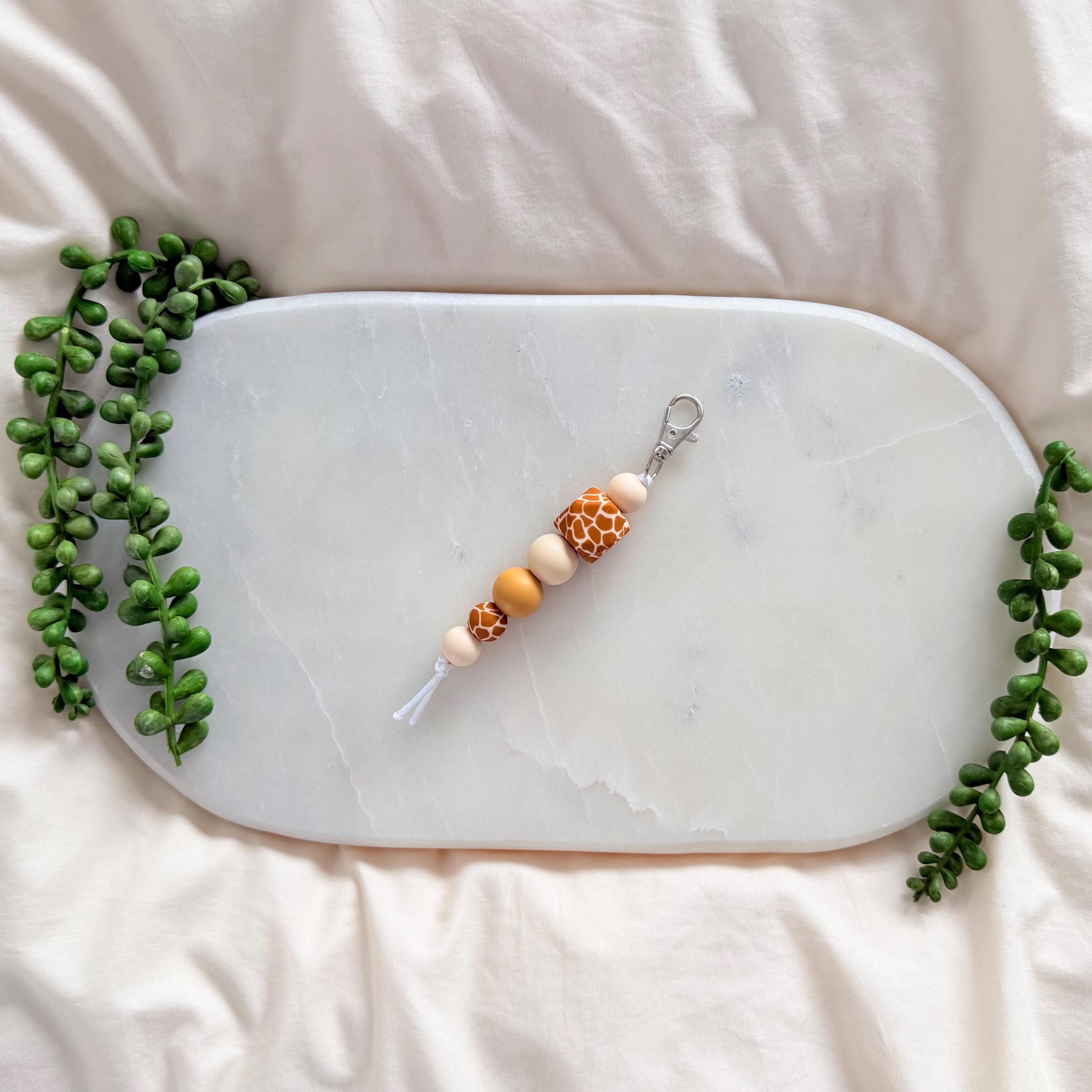 This giraffe print silicone bead keyring is a warm, neutral-toned accessory designed to add a subtle statement to your everyday essentials.