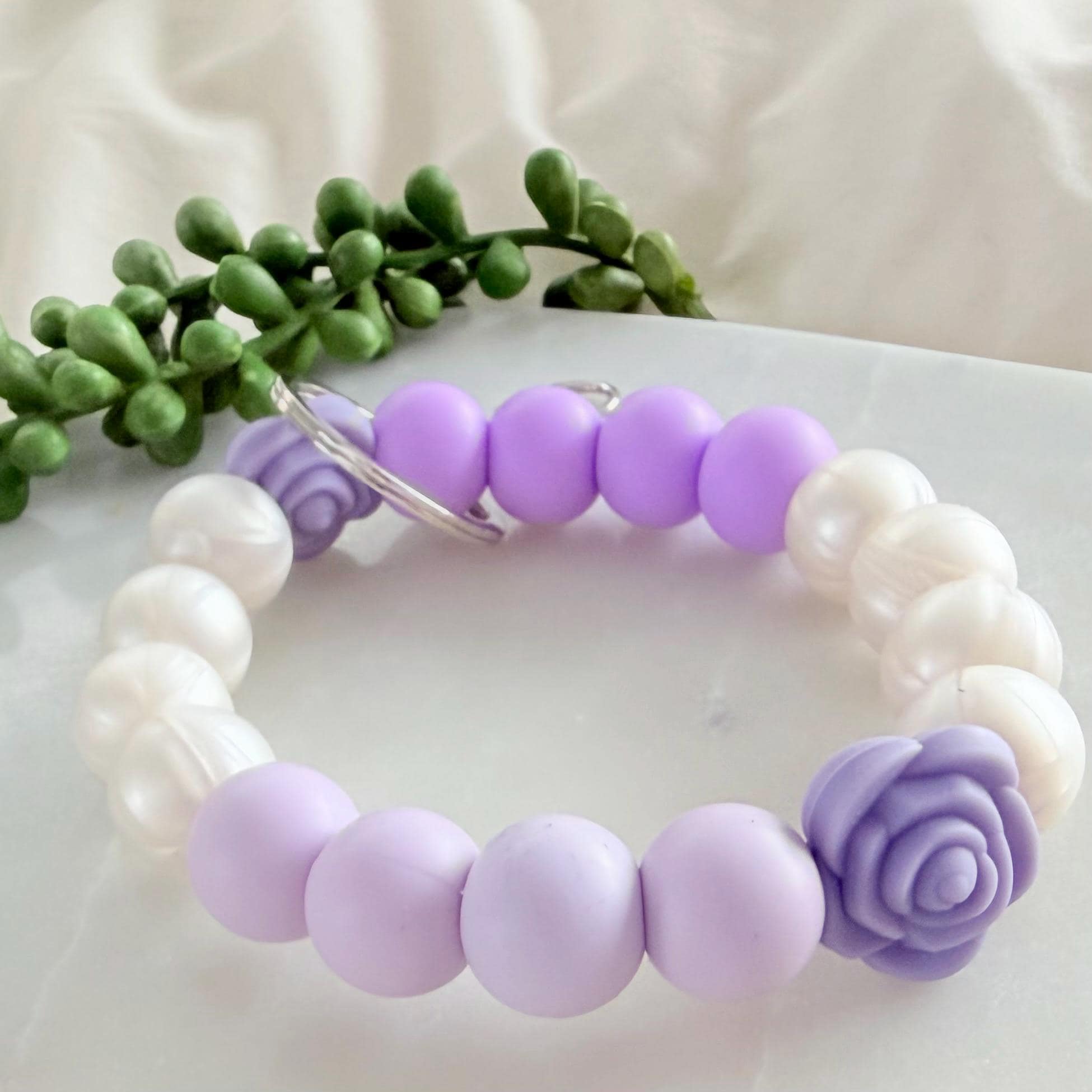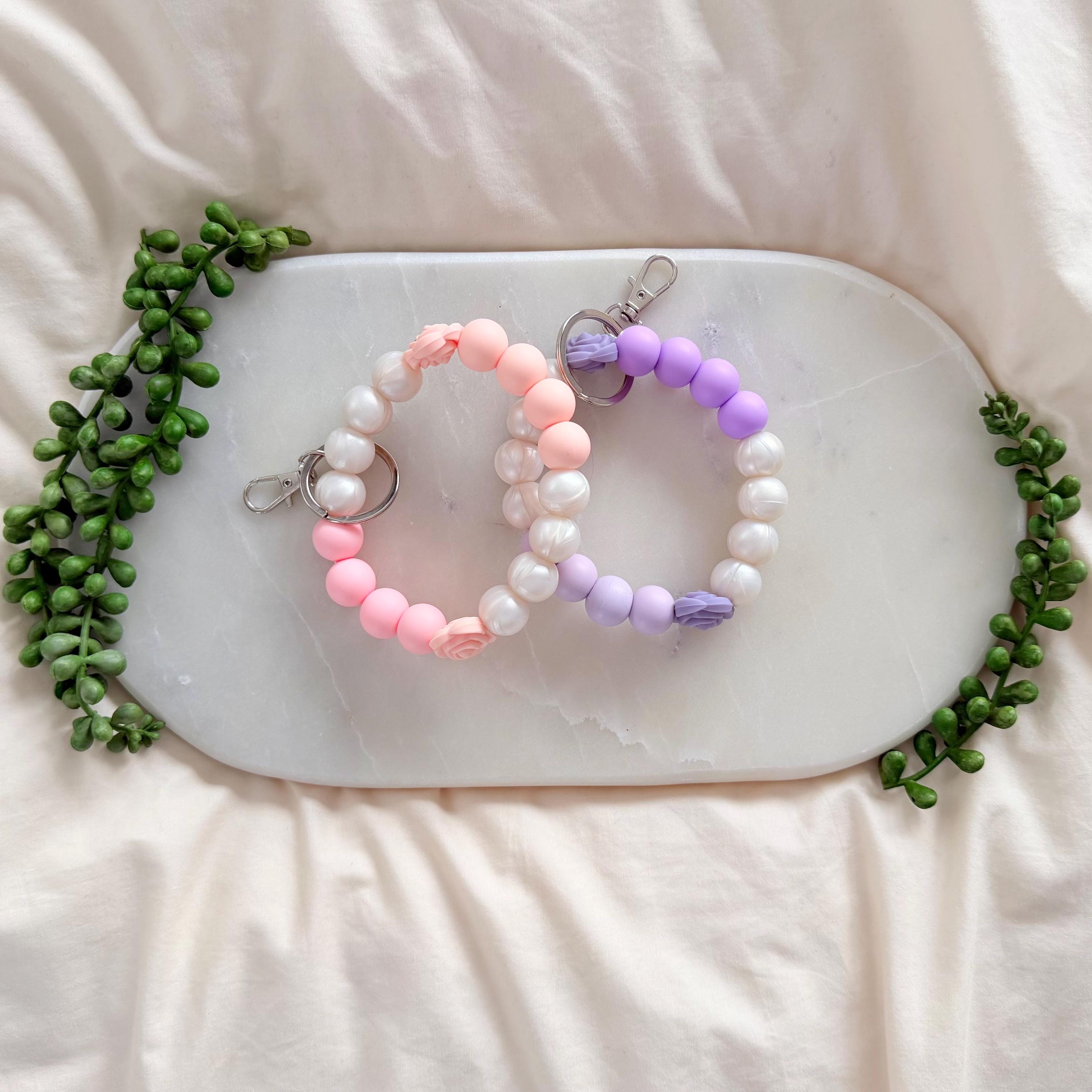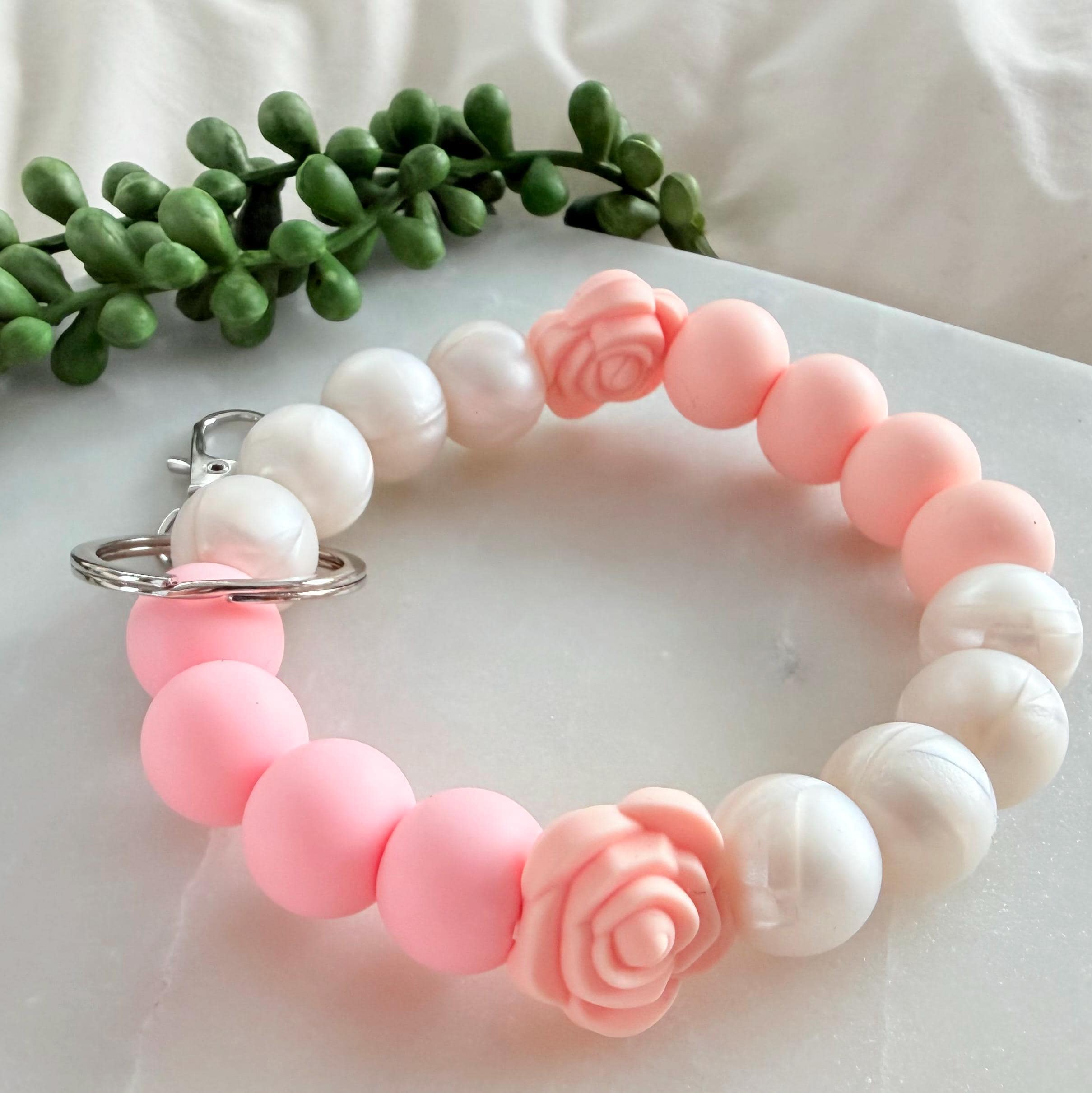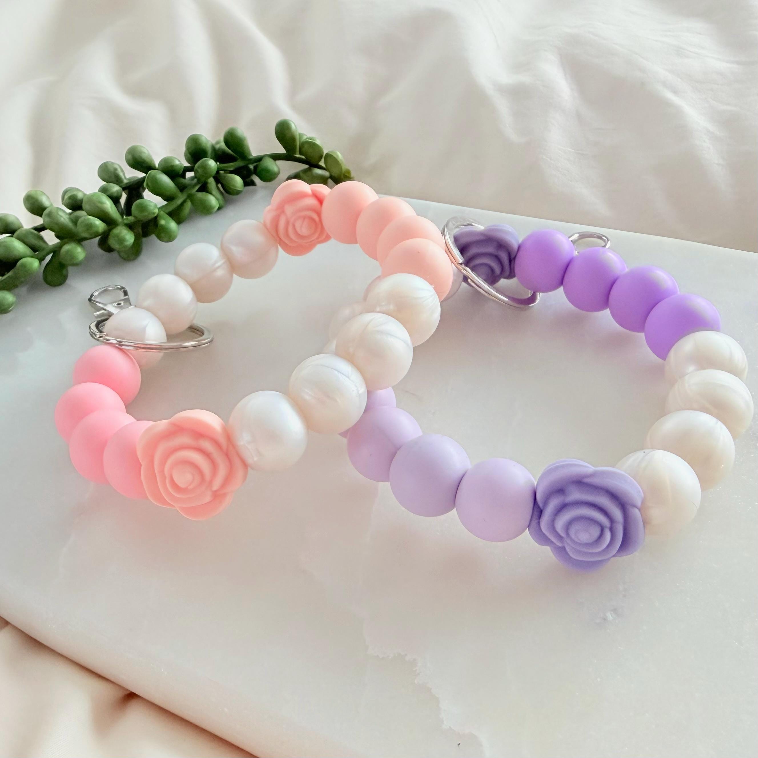 Add a soft, feminine touch to your everyday essentials with this handmade silicone bead wristlet keychain. Designed with a beautiful pastel colour palette and a delicate rose focal bead, this piece blends style and practicality effortlessly.