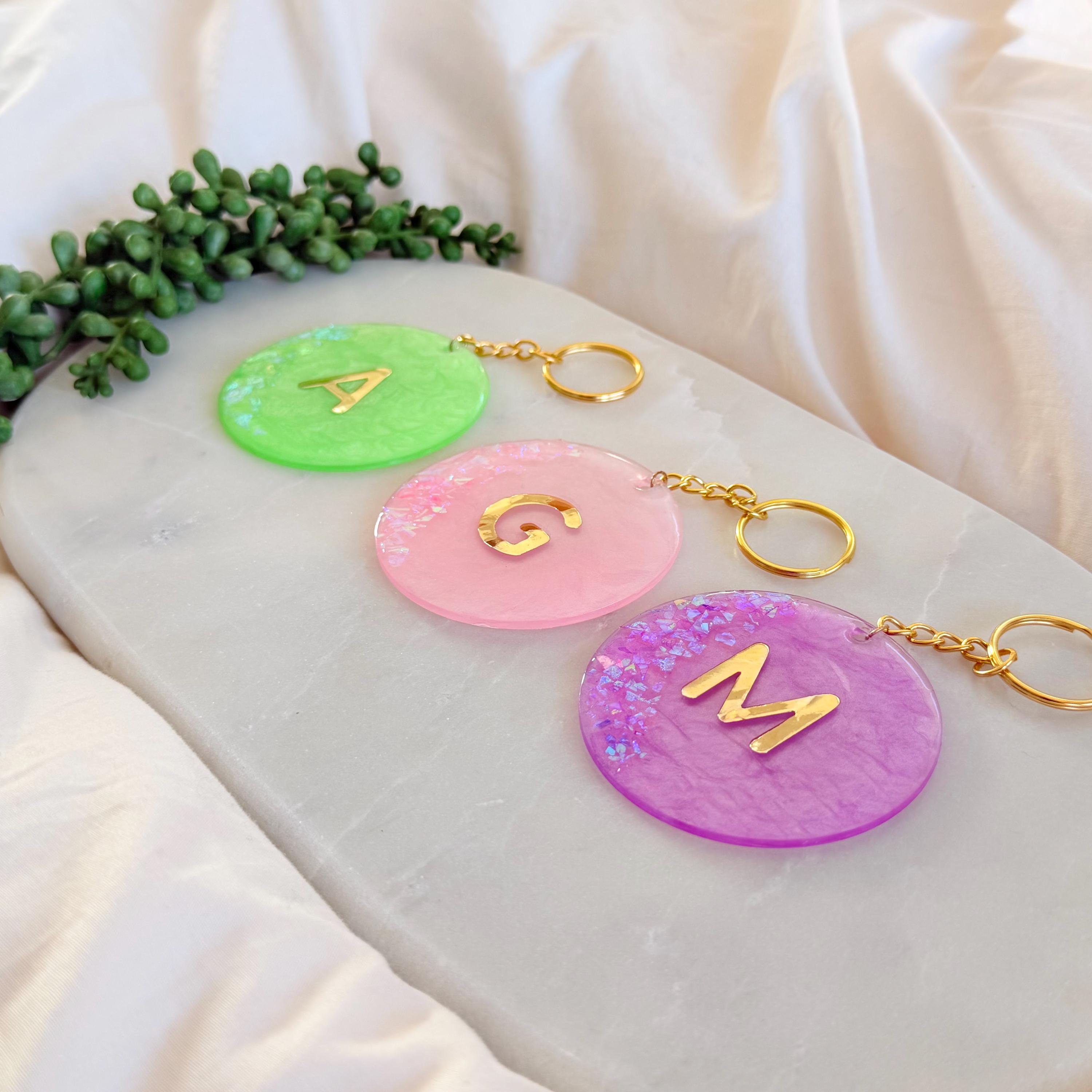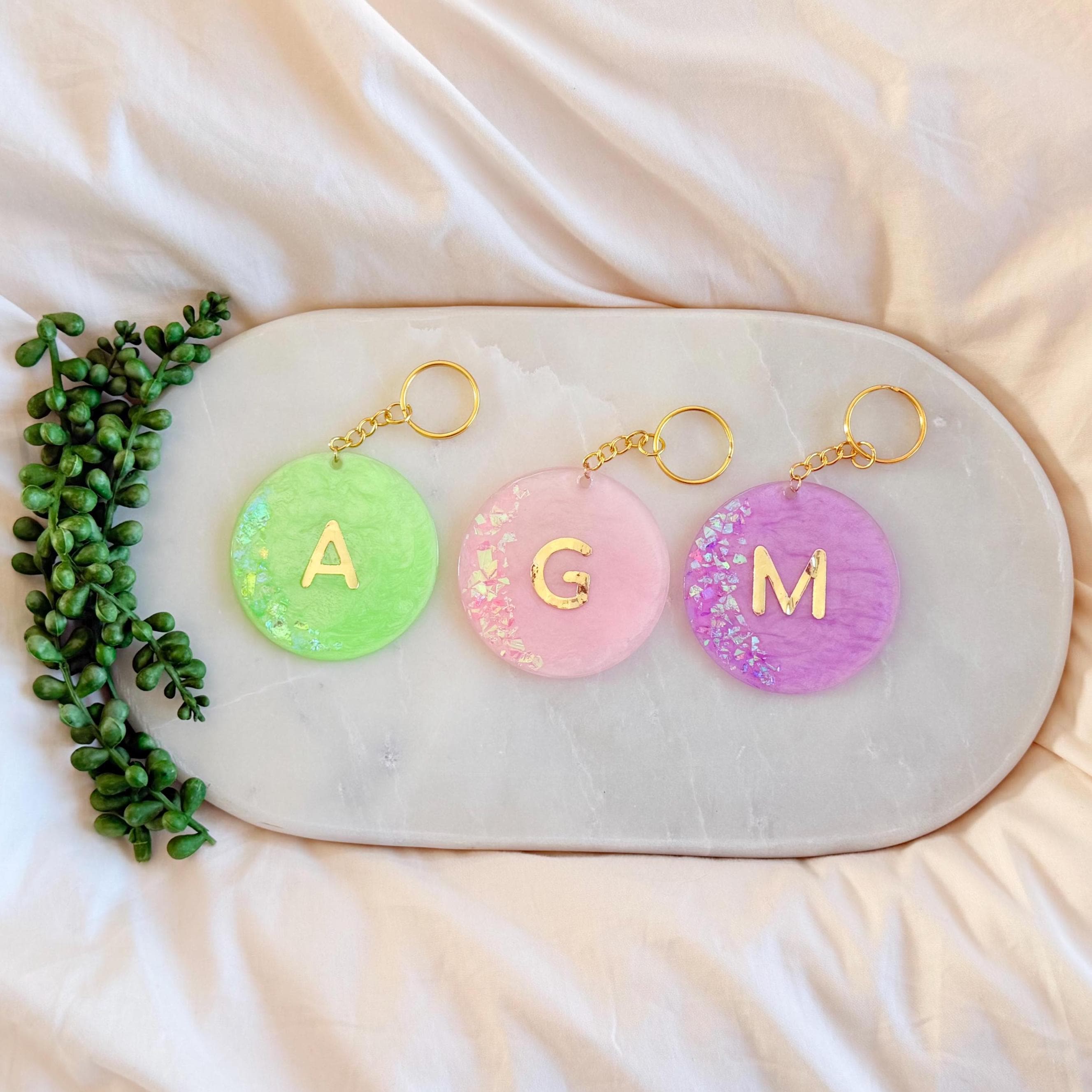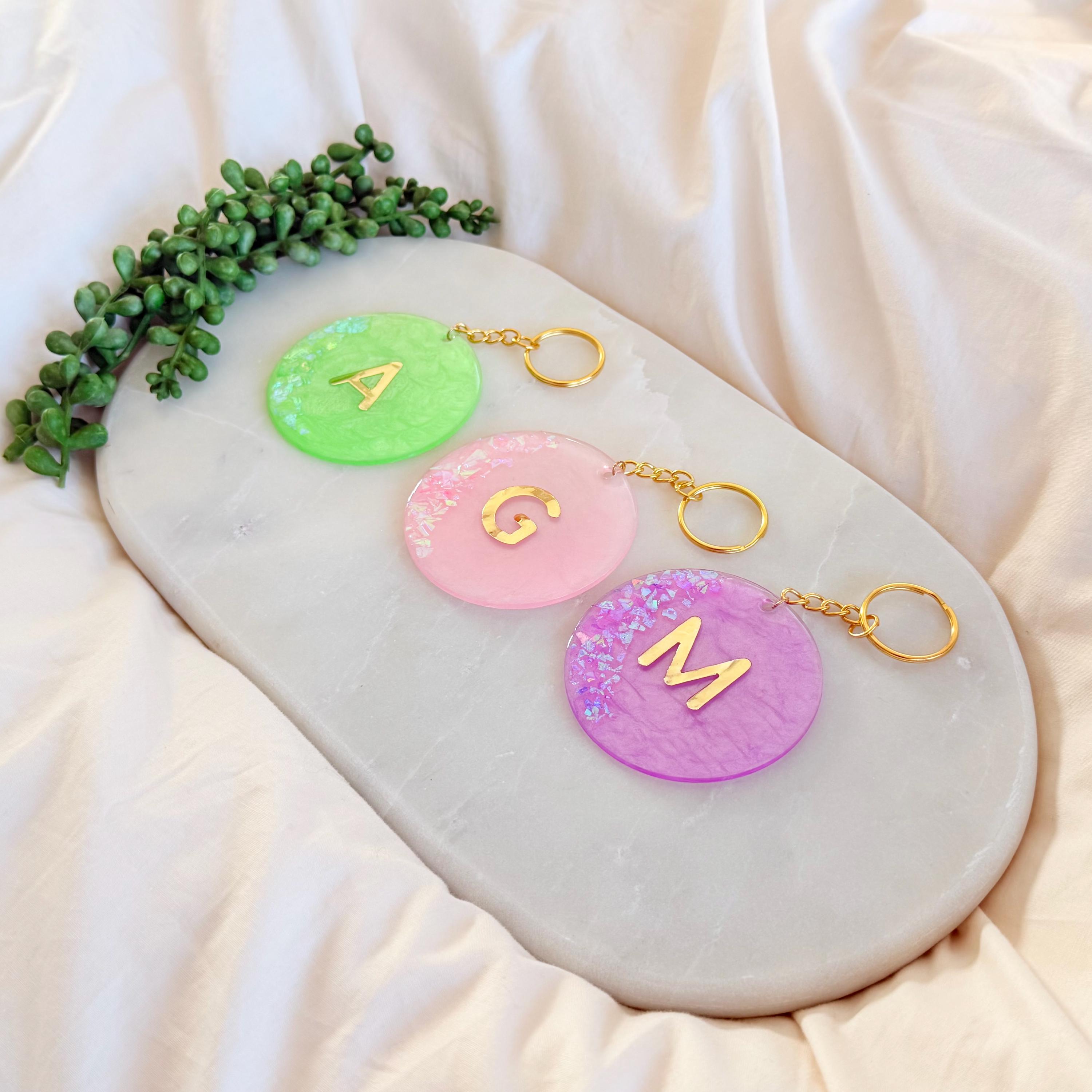 This personalised resin initial keyring is a soft, glossy statement piece designed to add a pretty, custom touch to your everyday essentials. Featuring a gold letter and dreamy iridescent detailing, it’s both practical and beautifully unique.