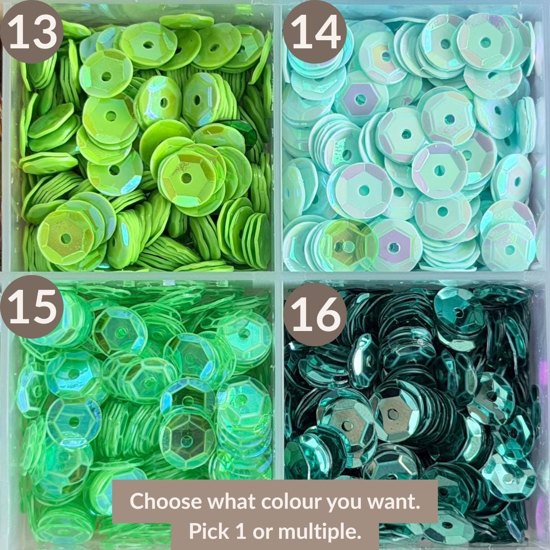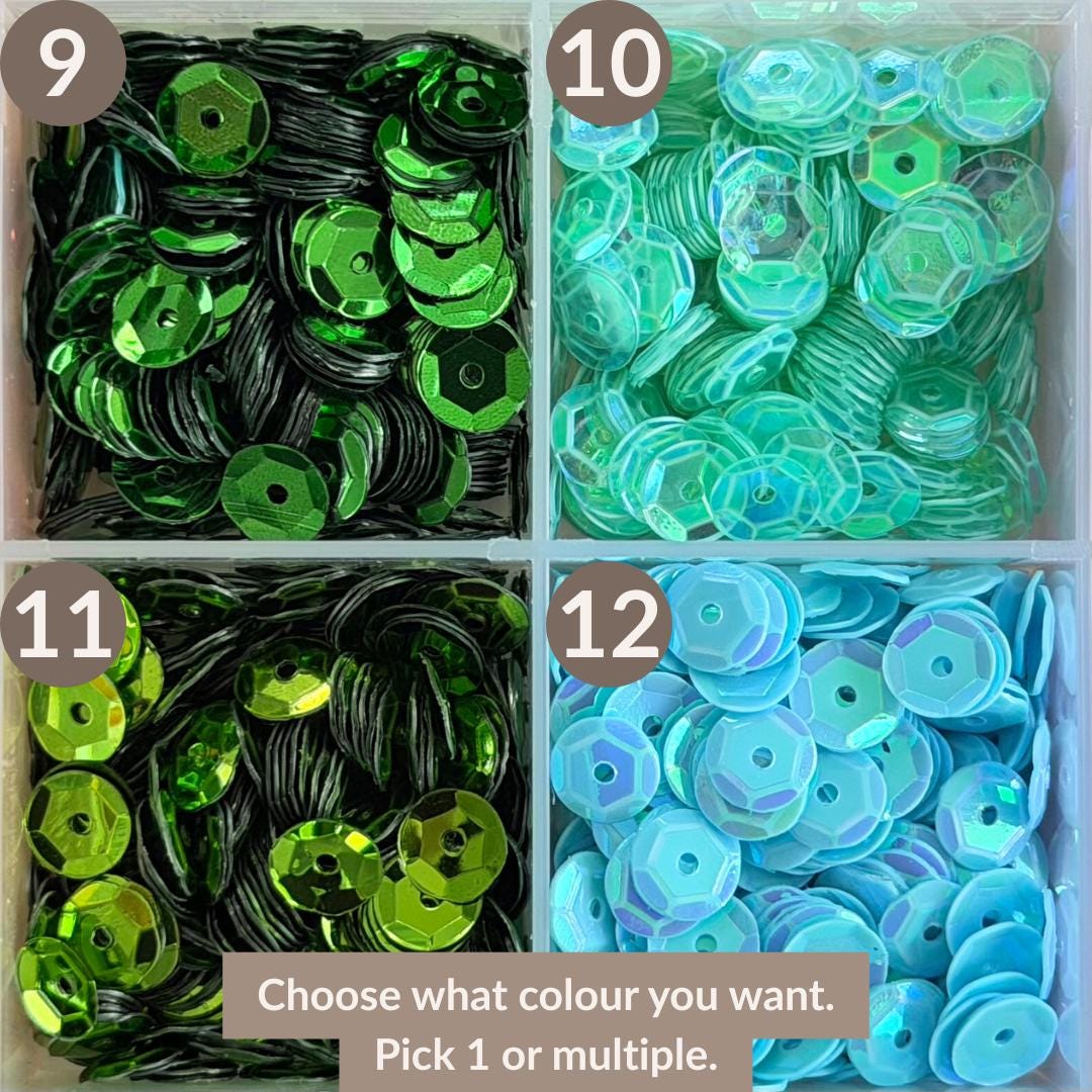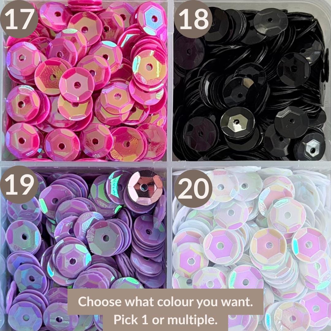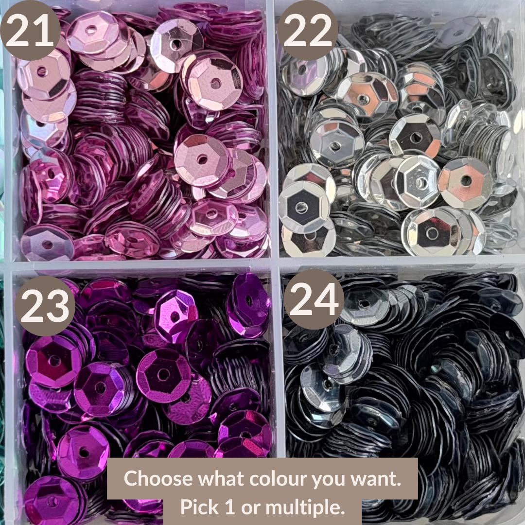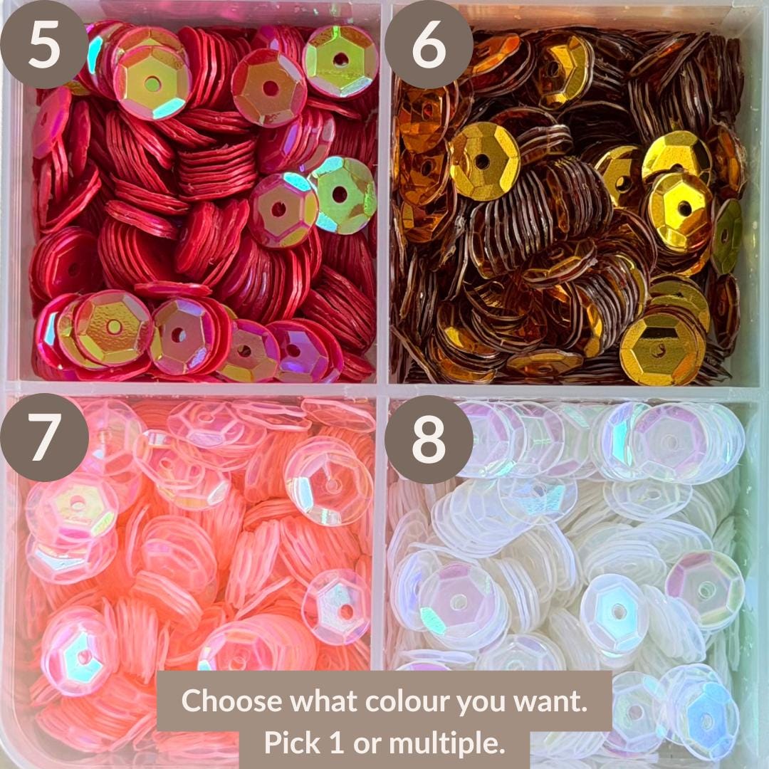 - Colours: Choose from a range of sequin colours (see chart in images)
