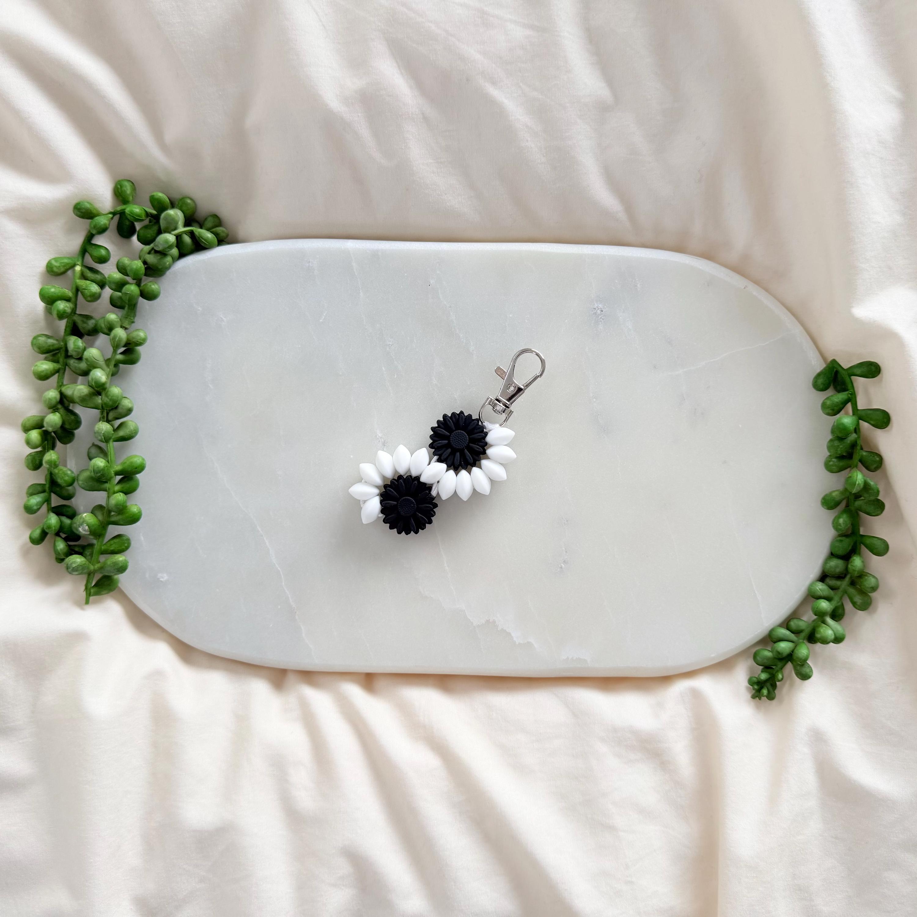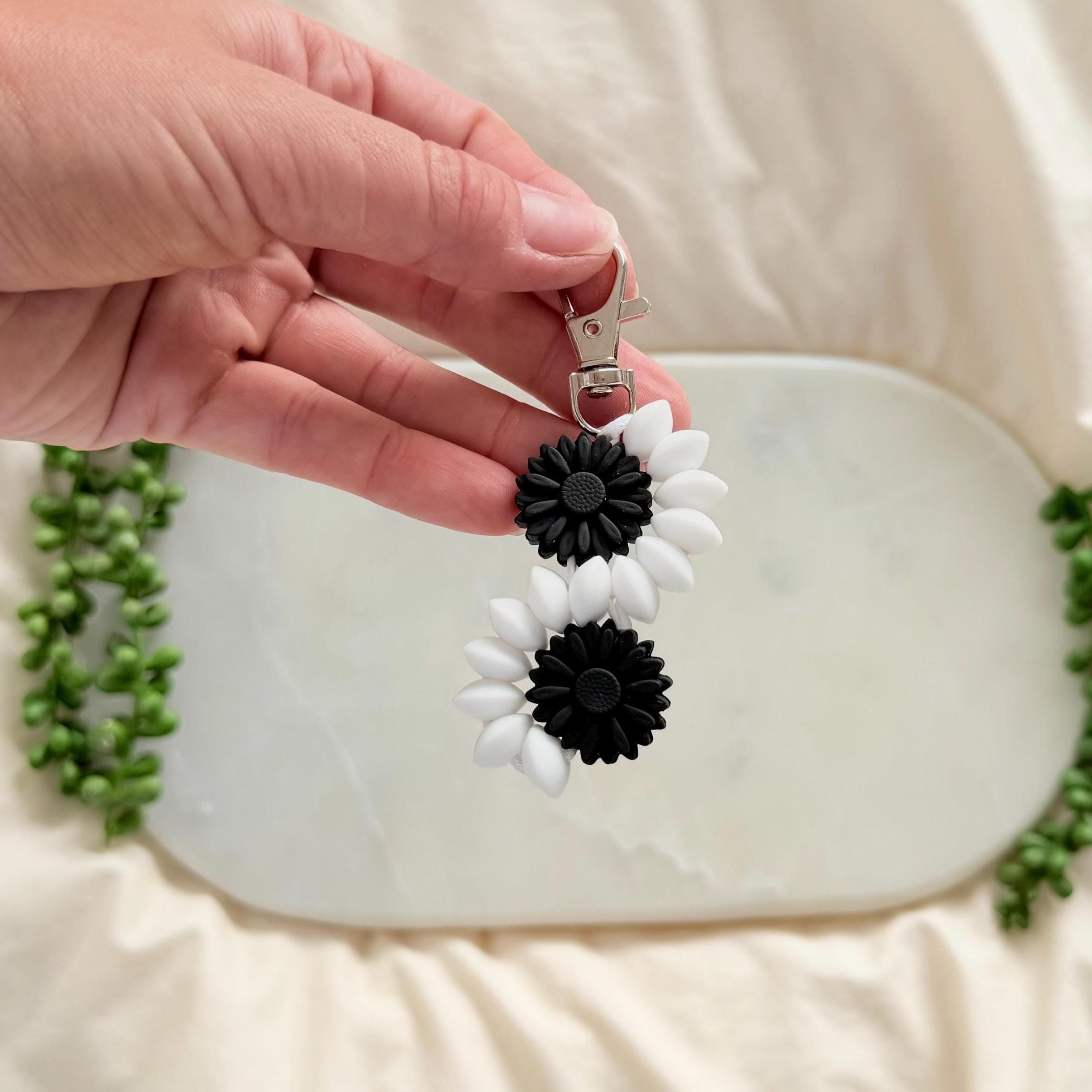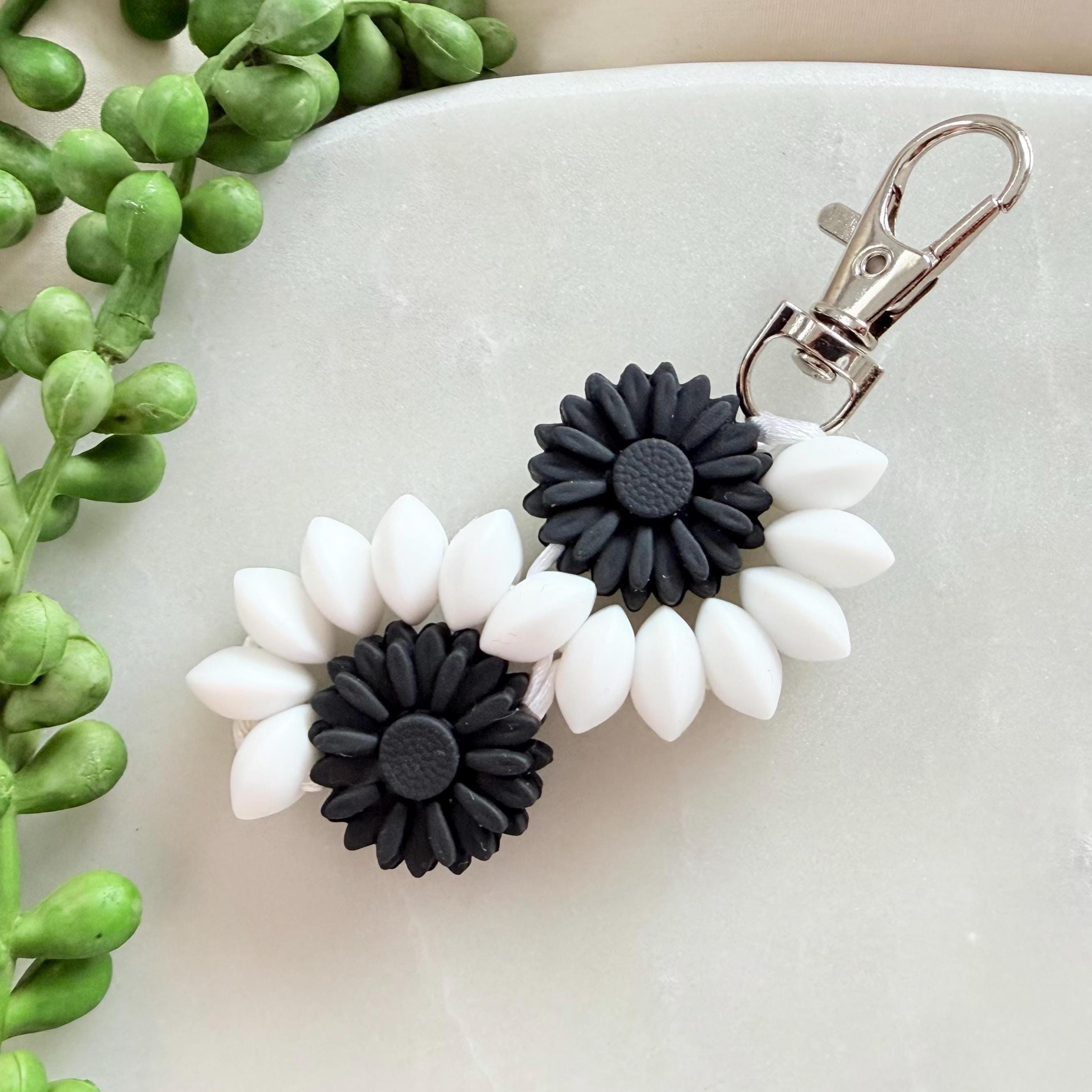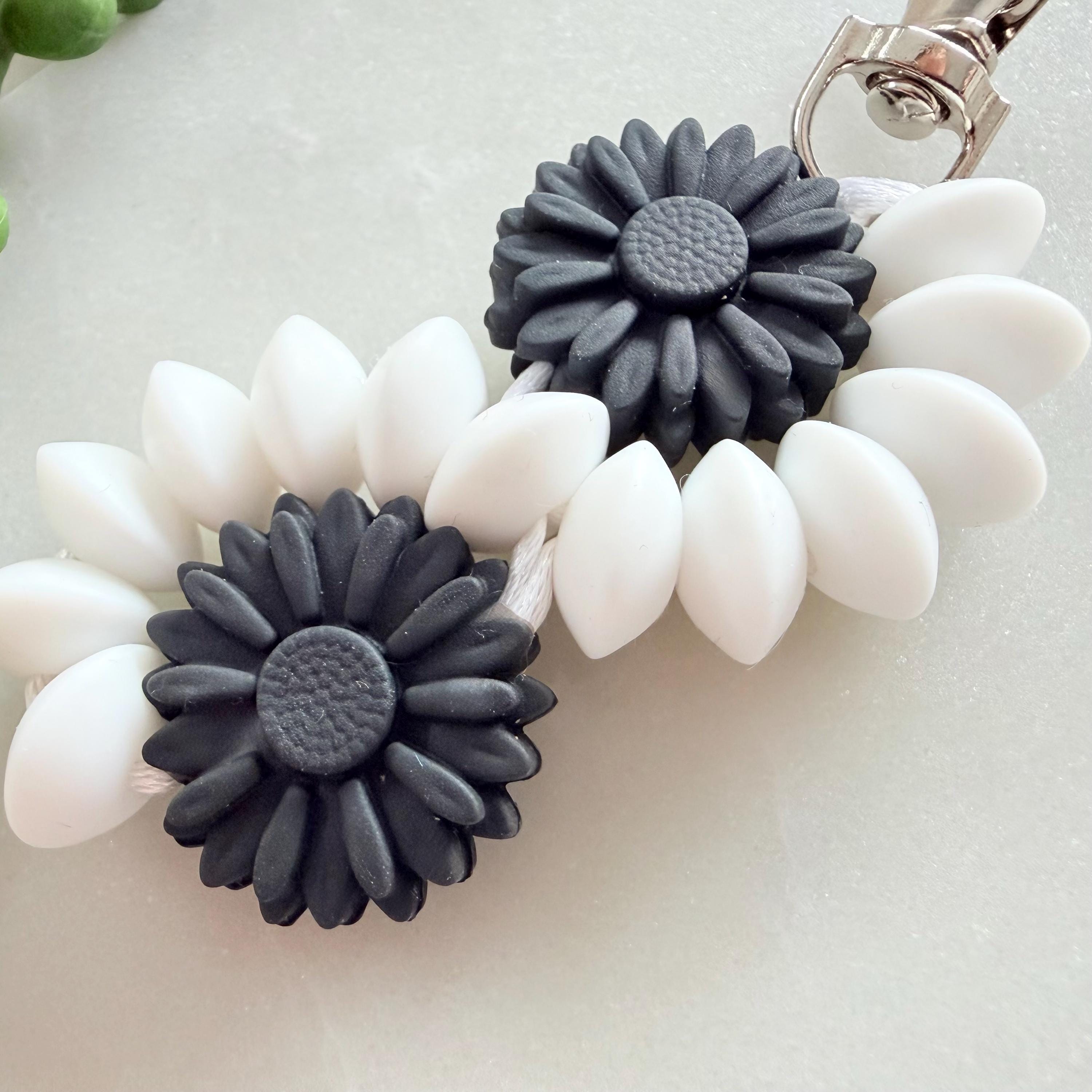 This black and white daisy silicone bead keyring features a bold neutral floral design, perfect for adding a modern, minimalist touch to your everyday essentials.