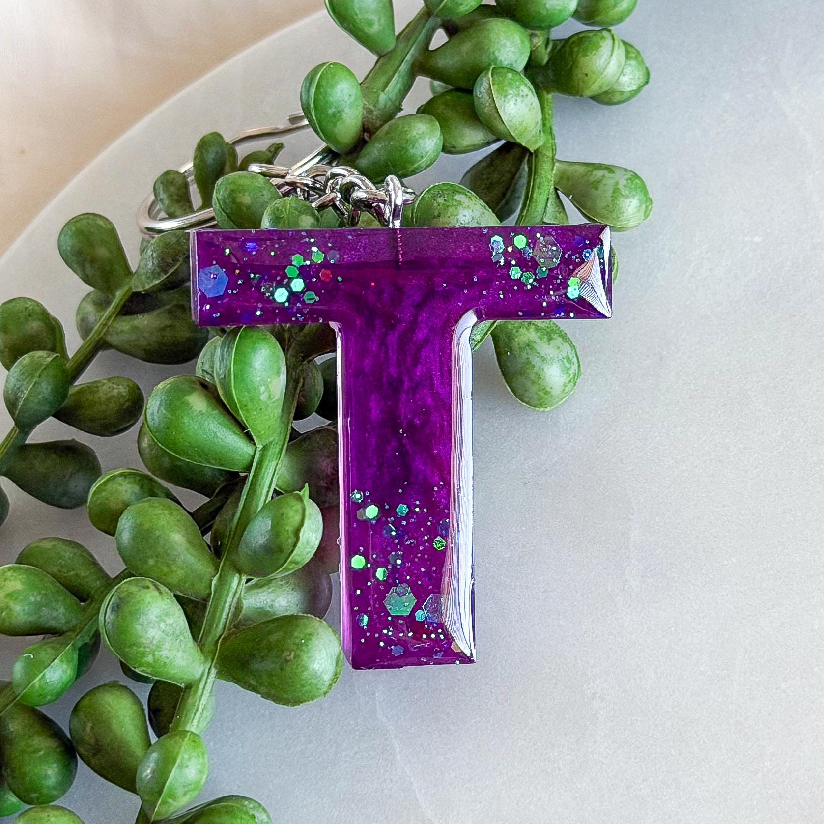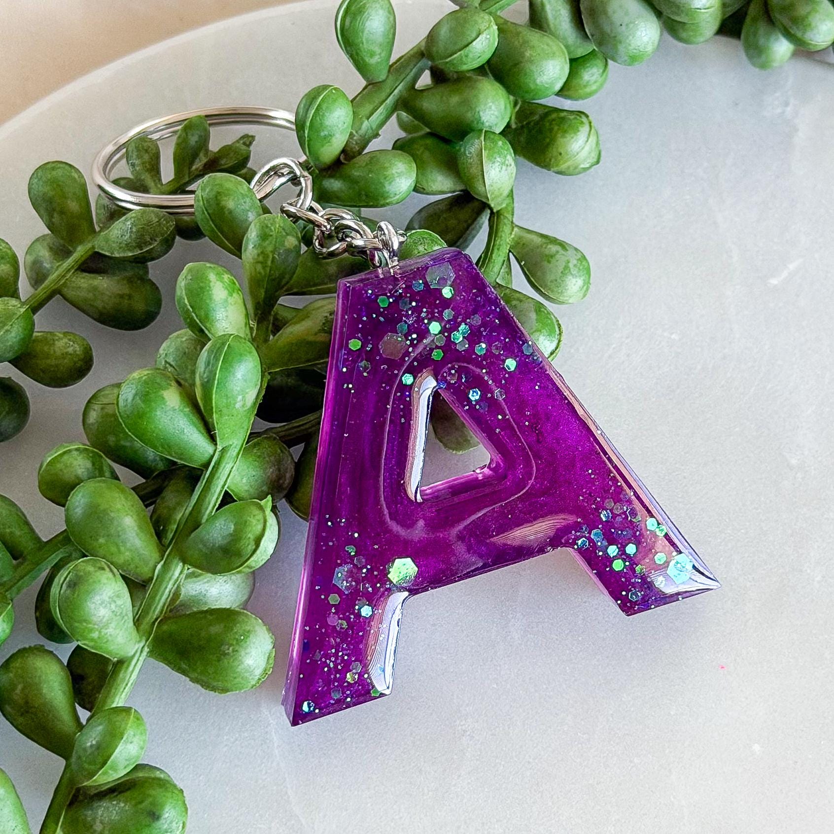 A dreamy amethyst initial keyring in rich purple resin with a sparkly finish, handmade to add a fun little pop of personality to your keys or bag.