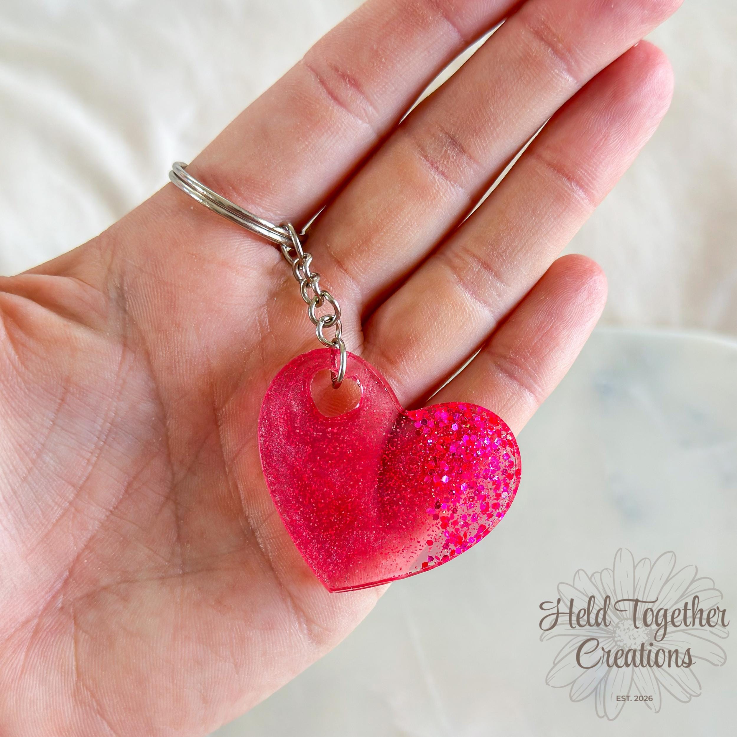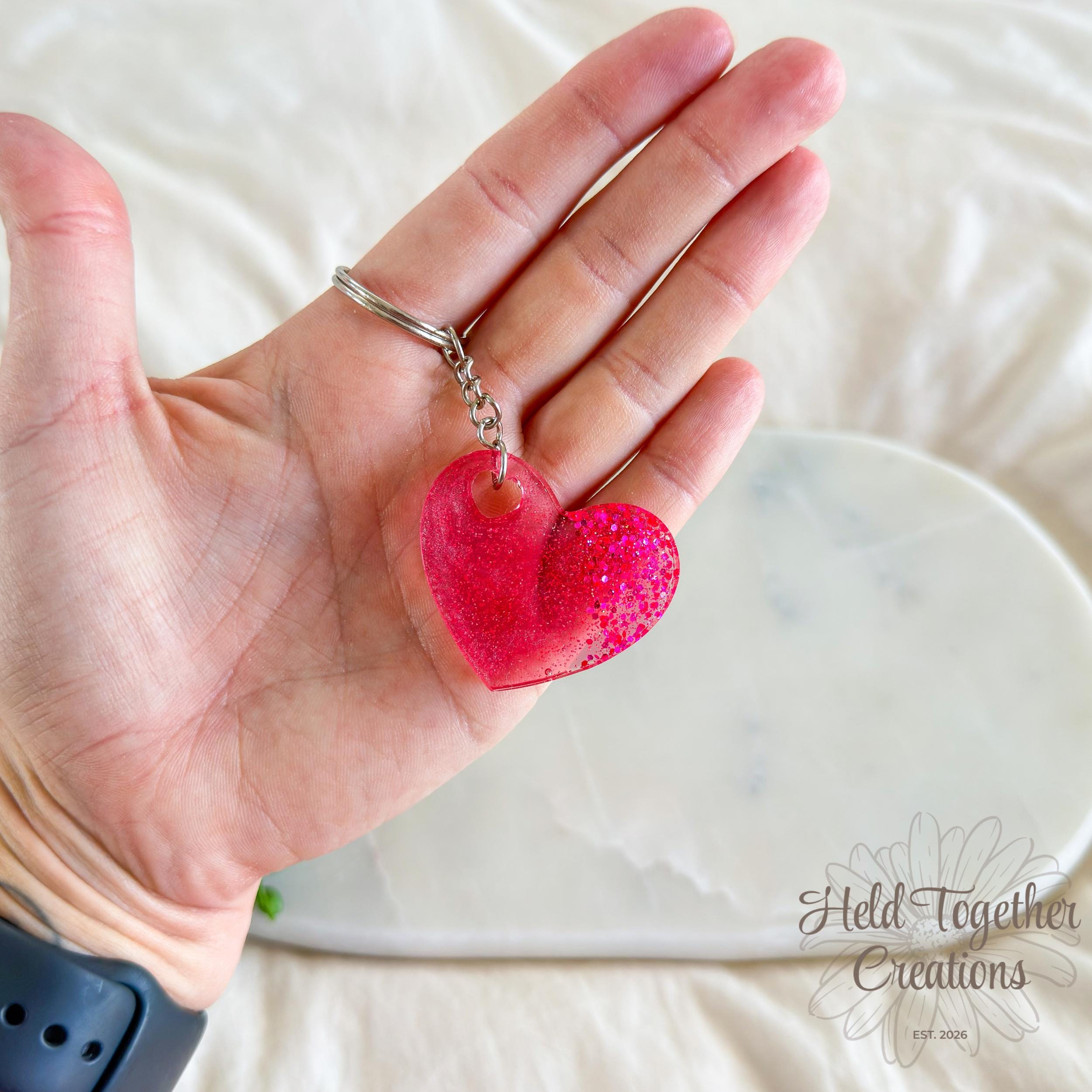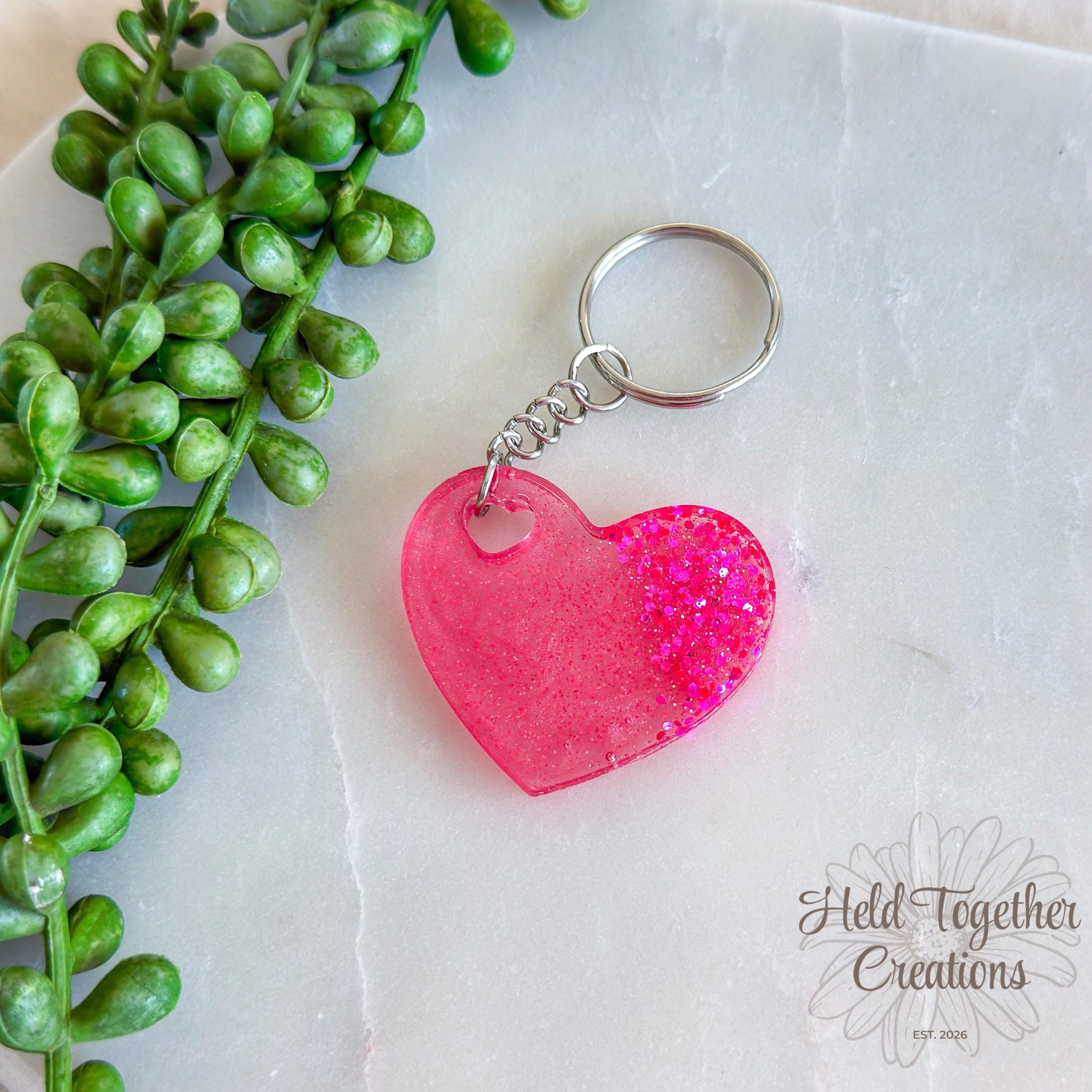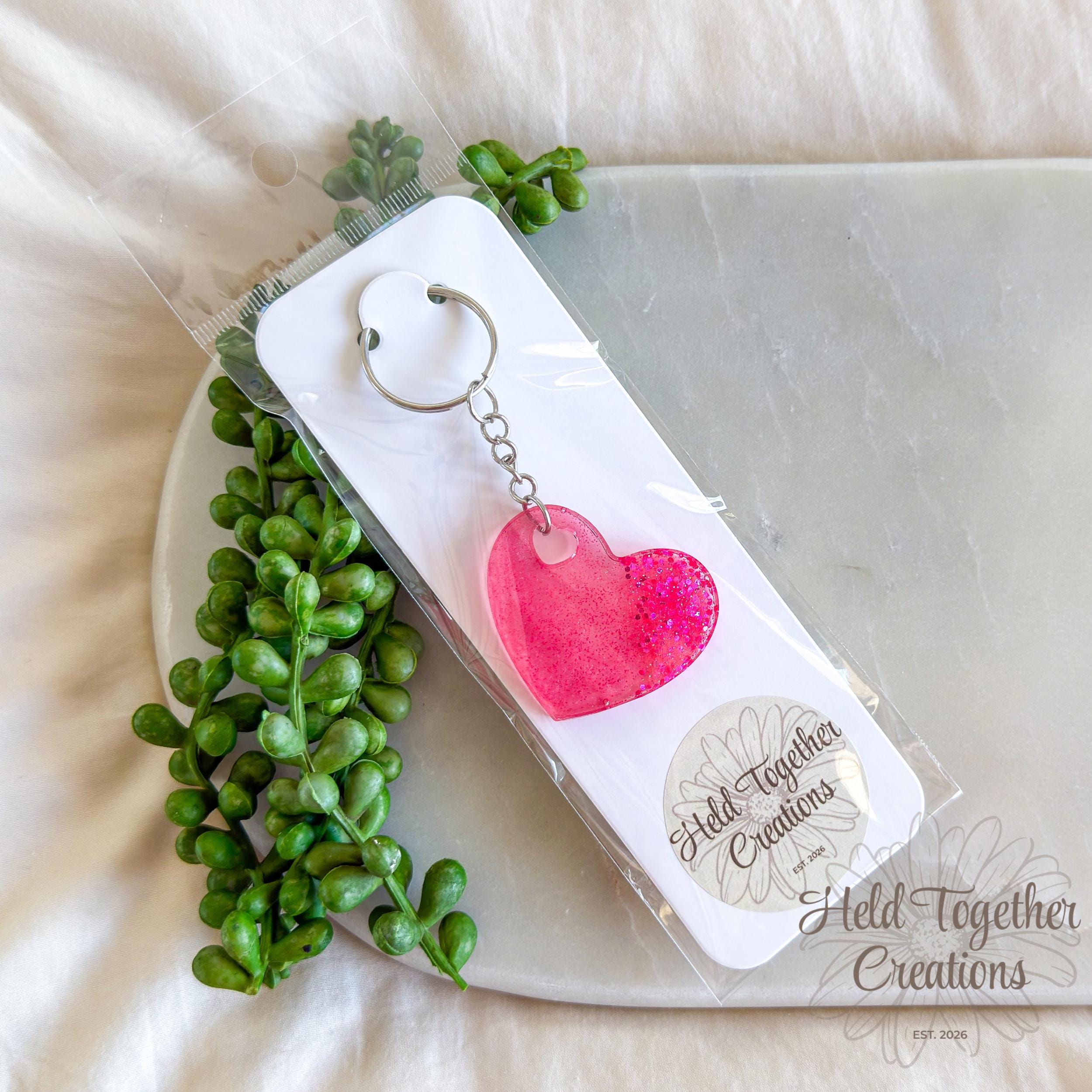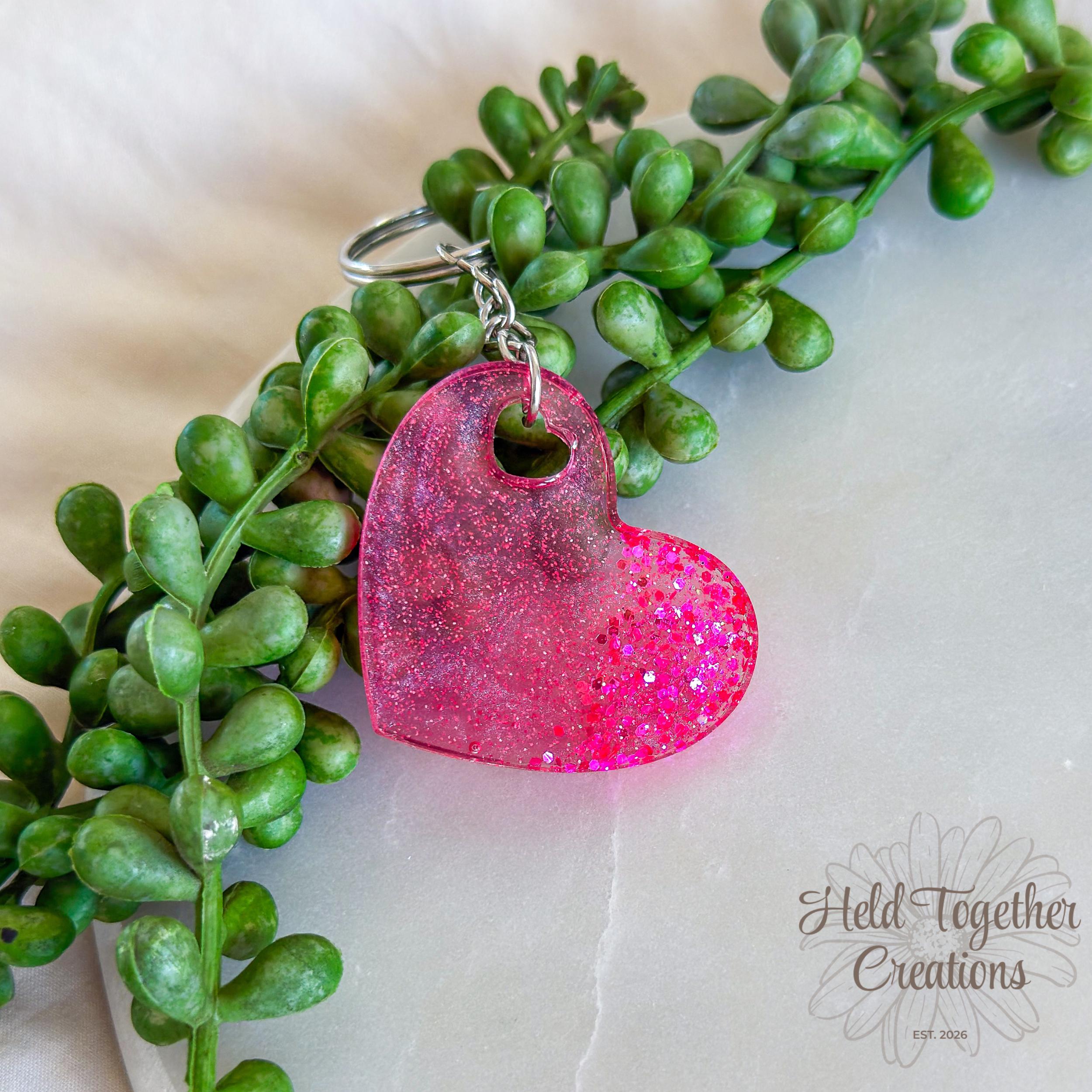 This handmade resin heart keyring features a dreamy translucent pink base with a glitter-packed edge for that extra sparkle moment. Cute, lightweight, and made to stand out on your keys or bag.