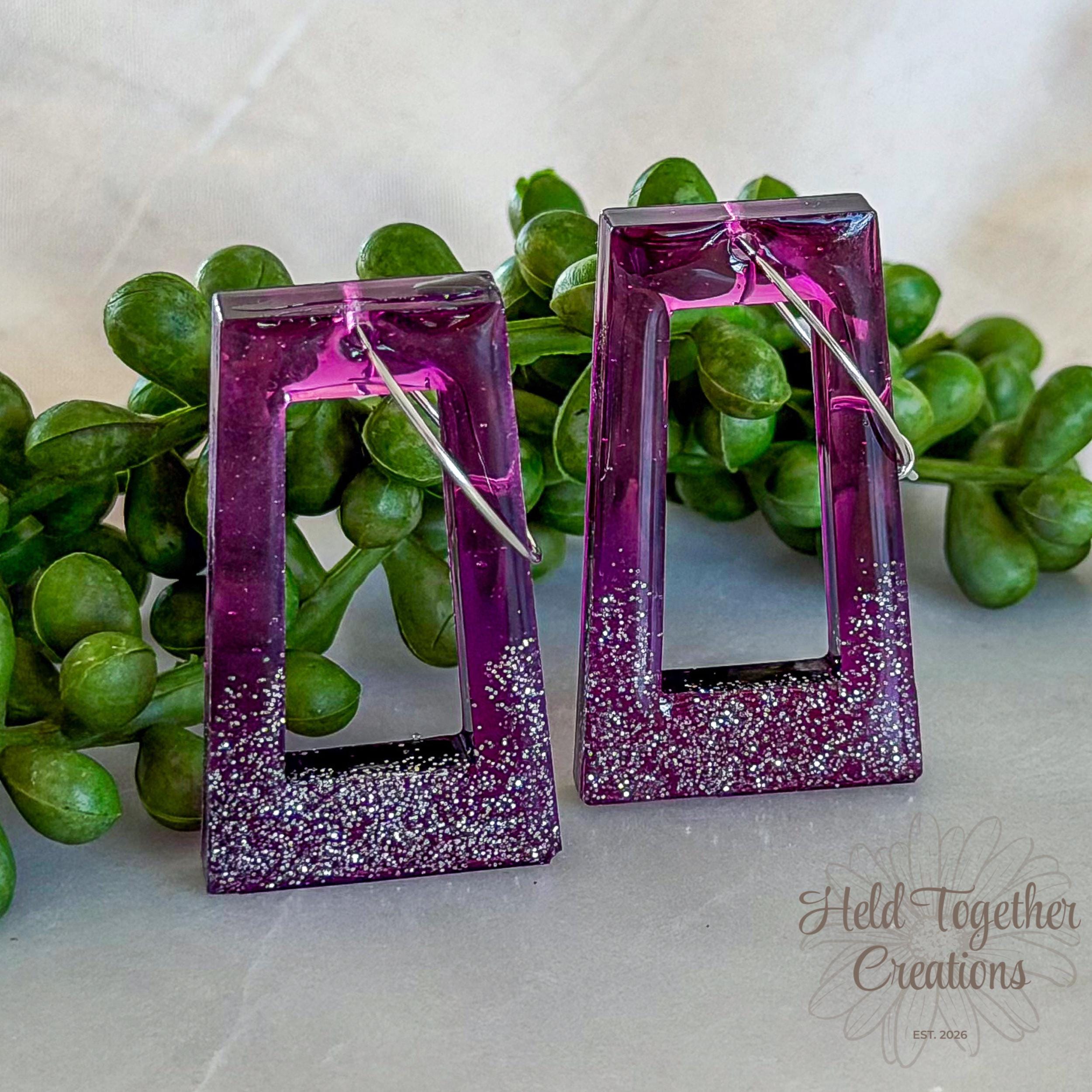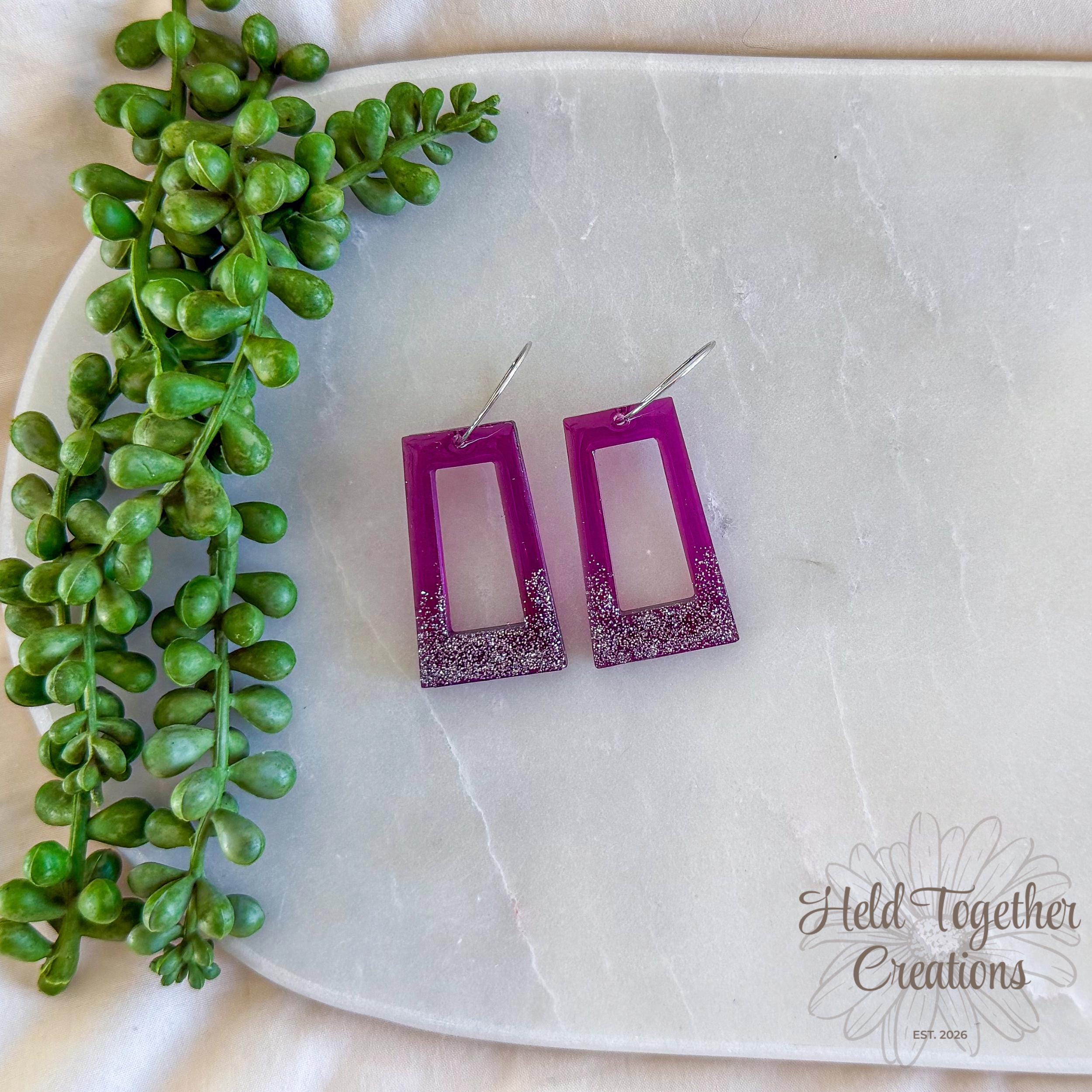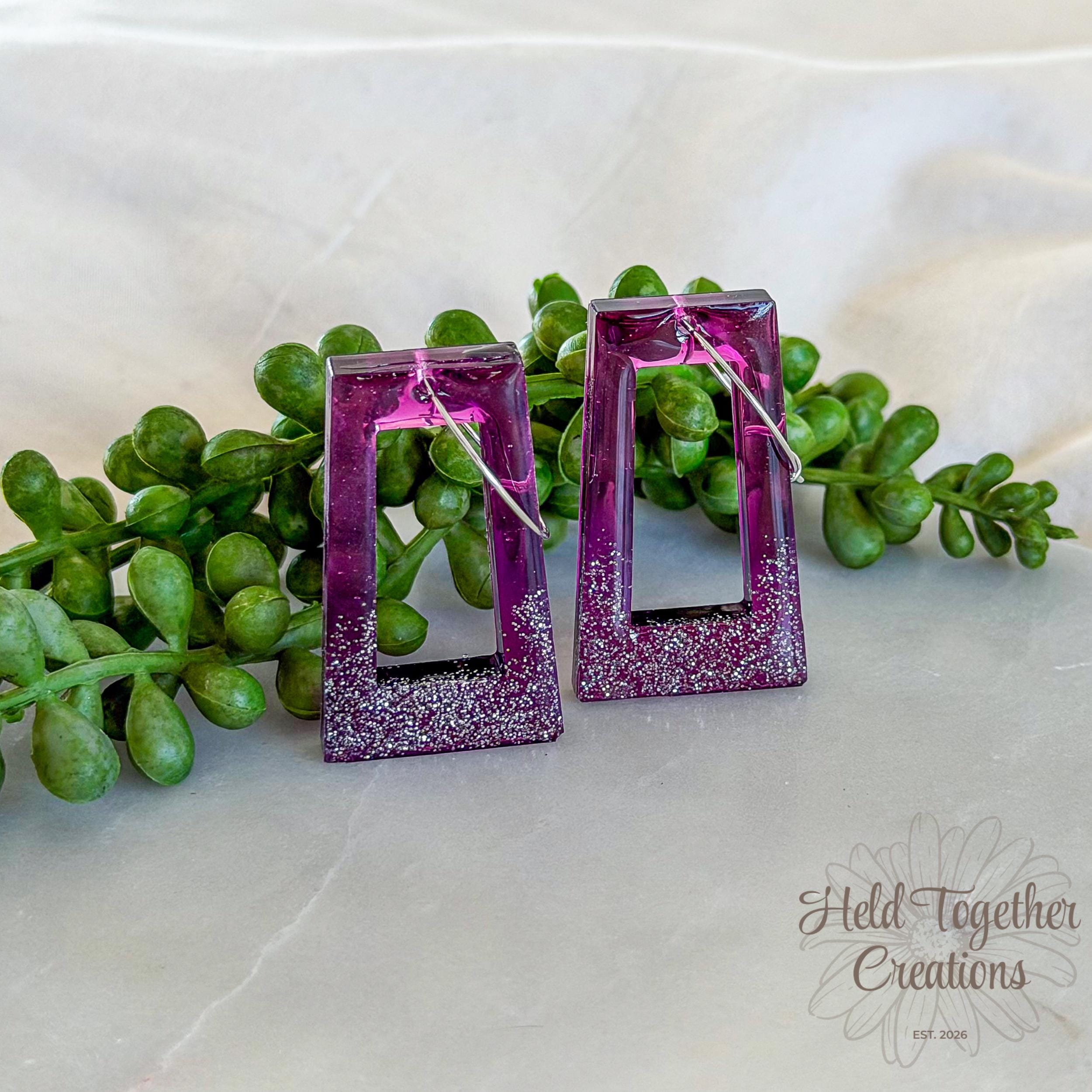 These handmade resin rectangle earrings feature a rich purple tone with a soft glitter fade, creating a statement piece that’s still lightweight enough for all-day wear. Designed to catch the light beautifully while keeping things minimal and modern.