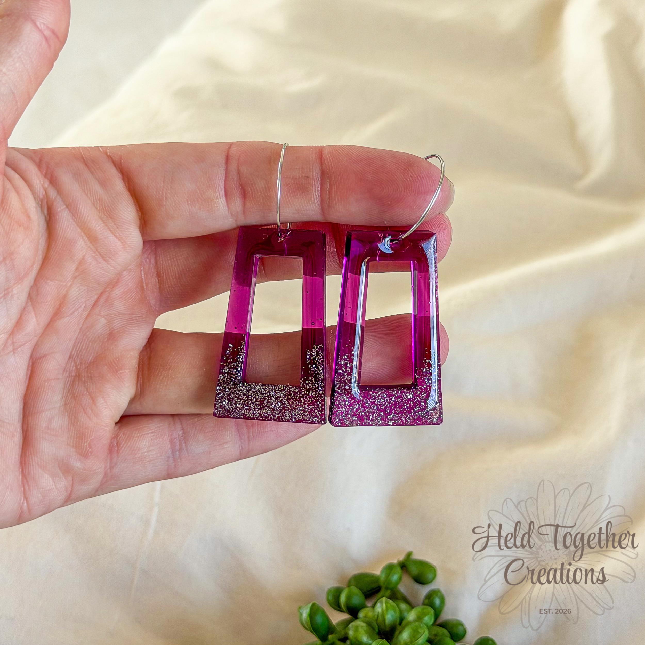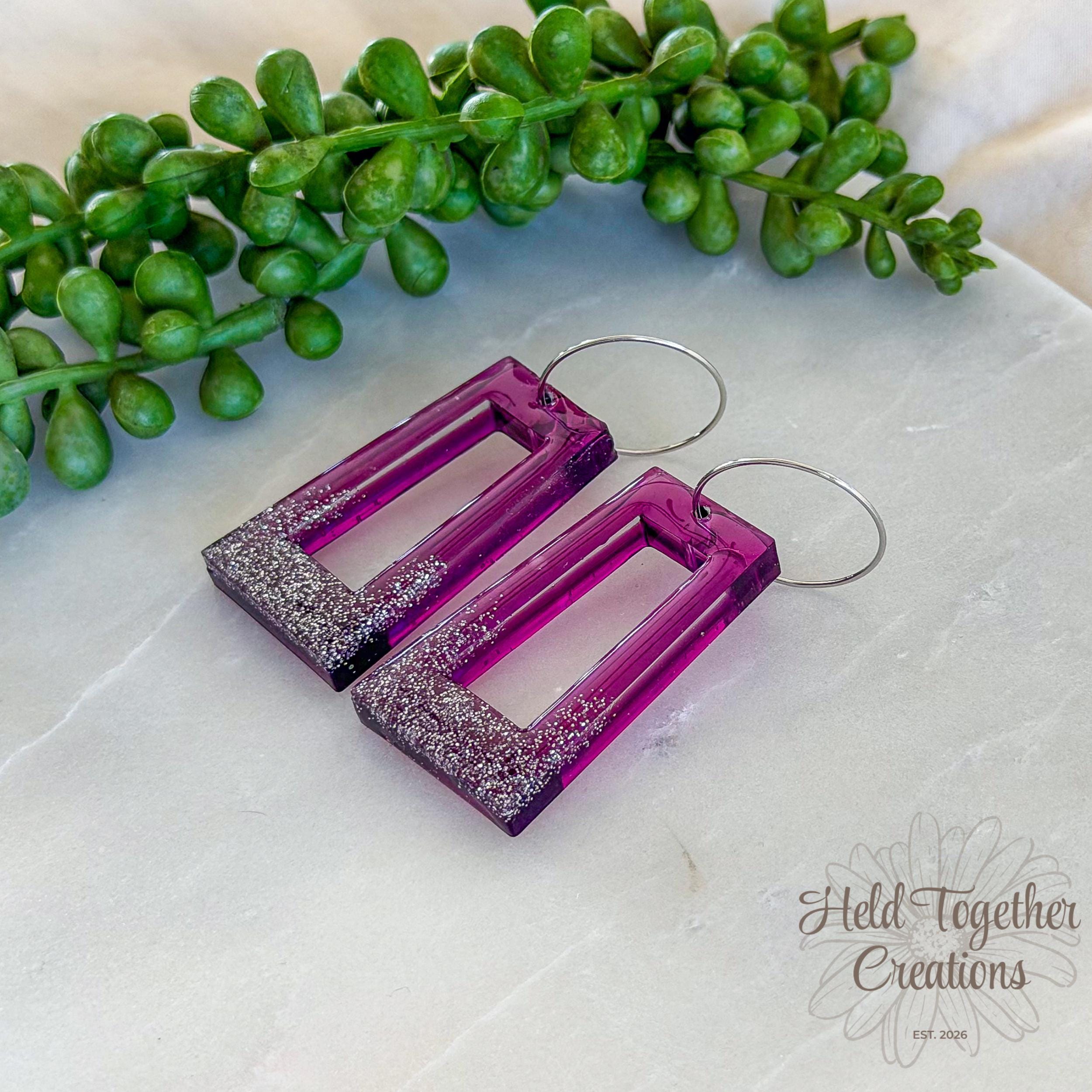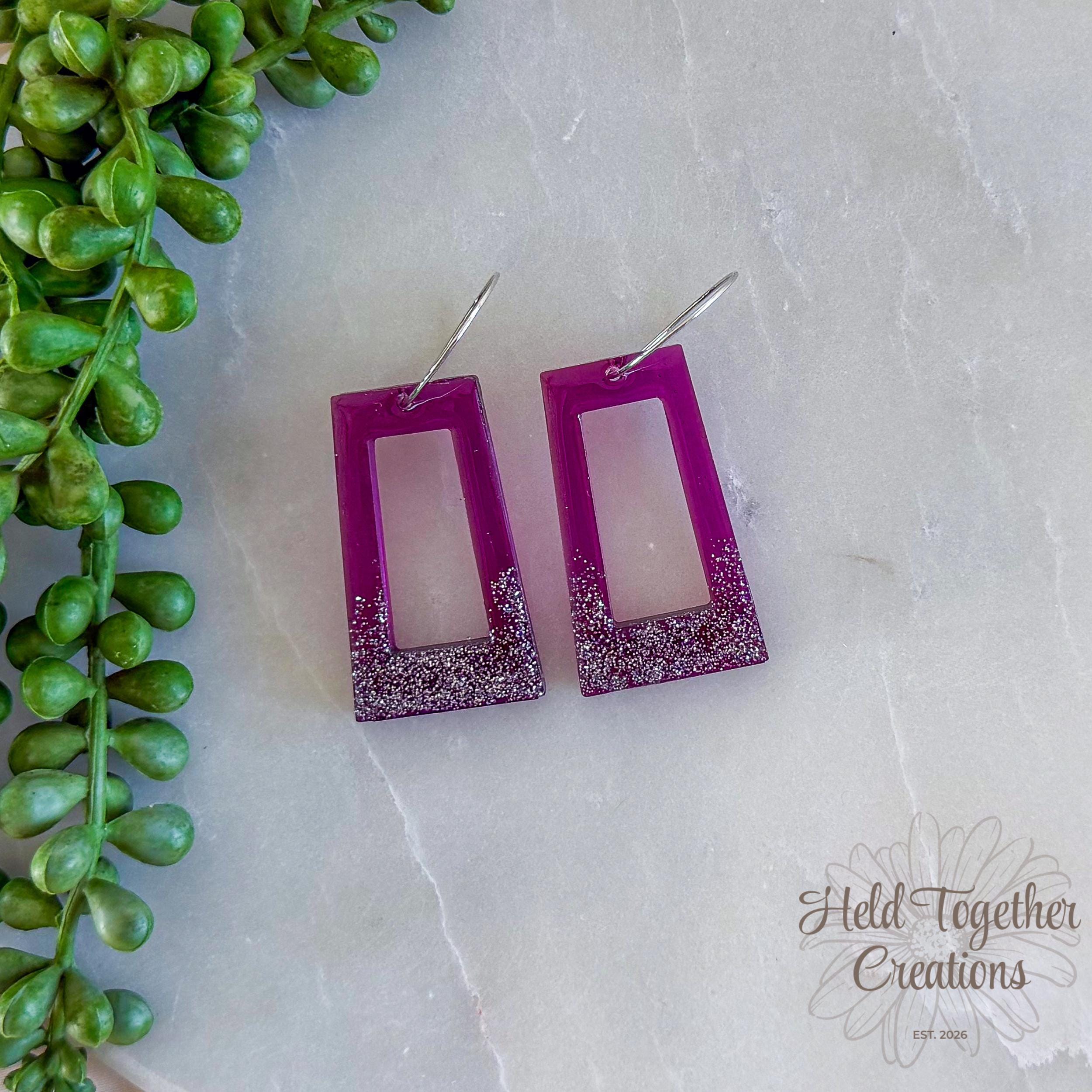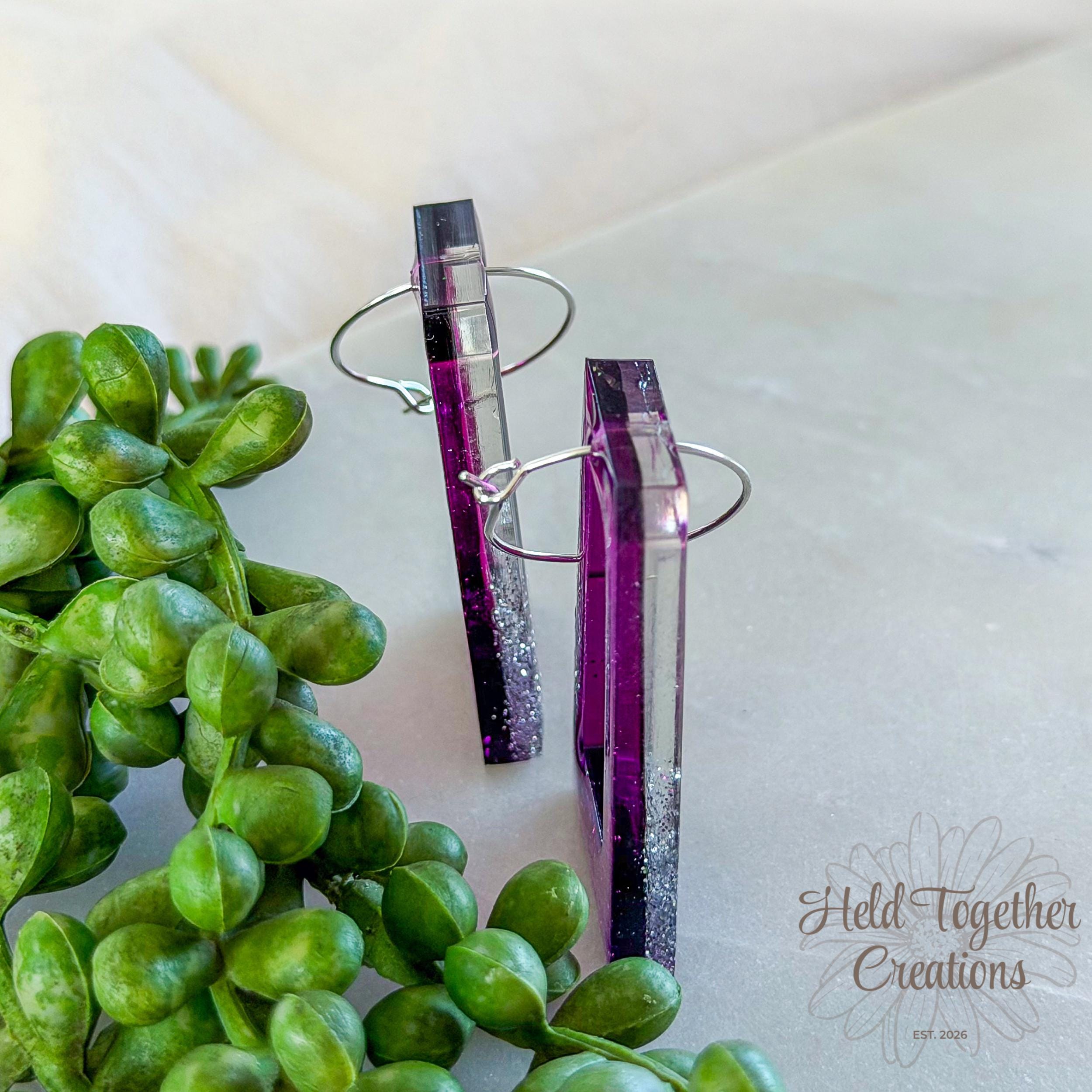 These handmade resin rectangle earrings feature a rich purple tone with a soft glitter fade, creating a statement piece that’s still lightweight enough for all-day wear. Designed to catch the light beautifully while keeping things minimal and modern.