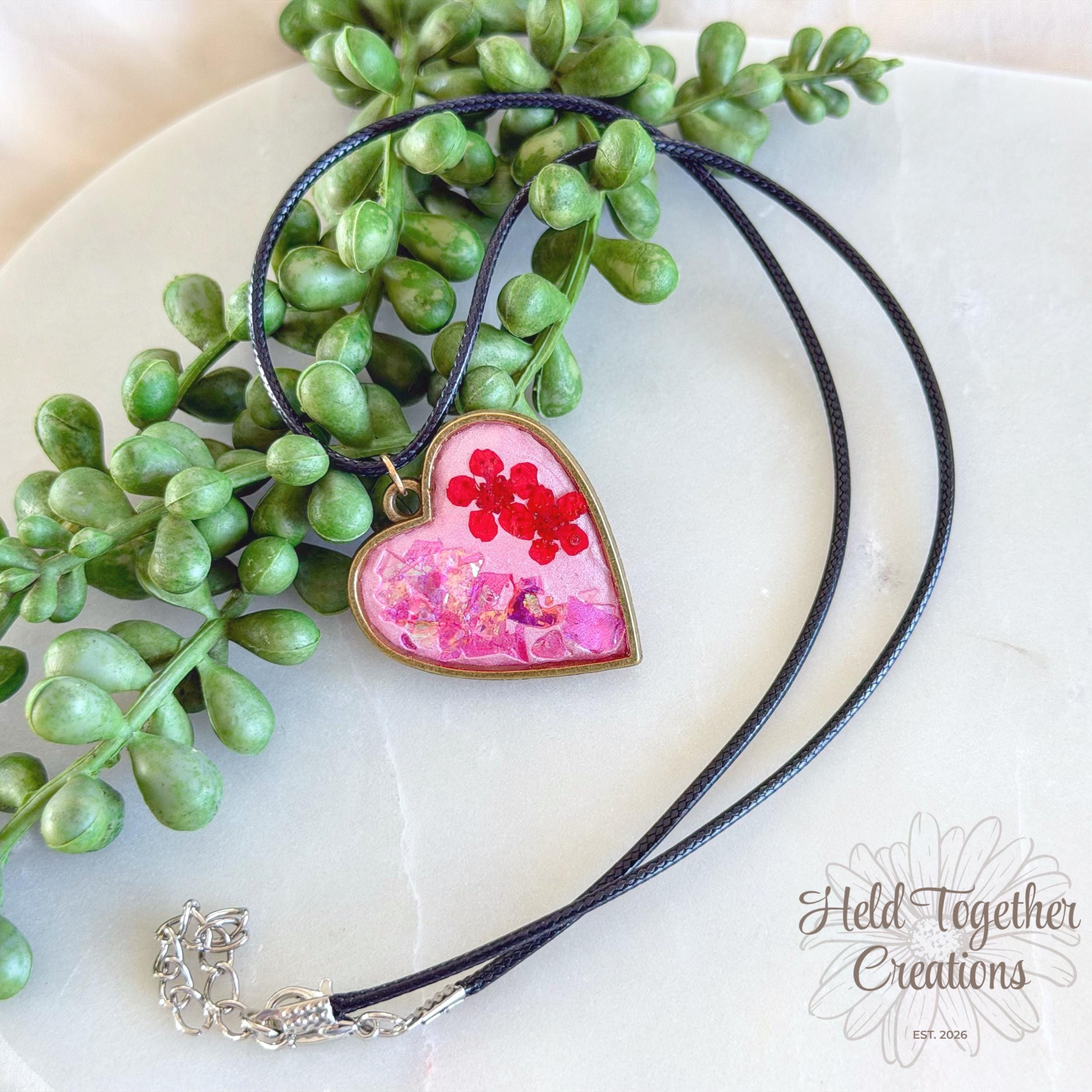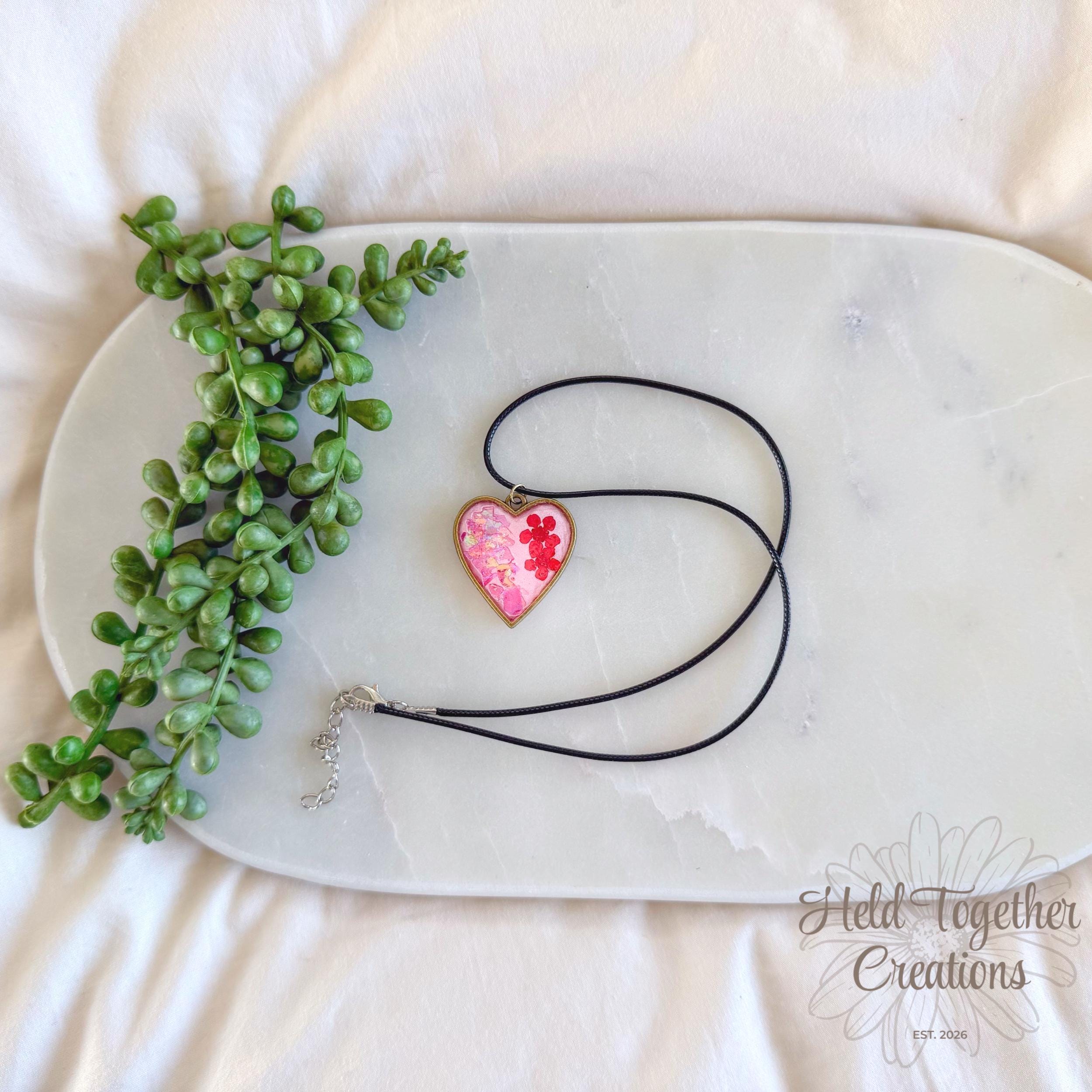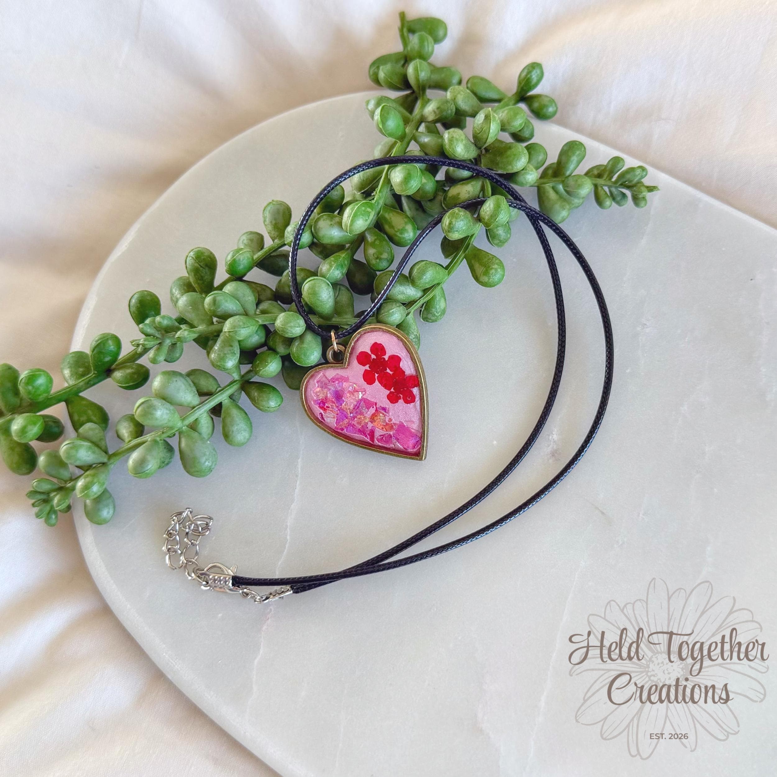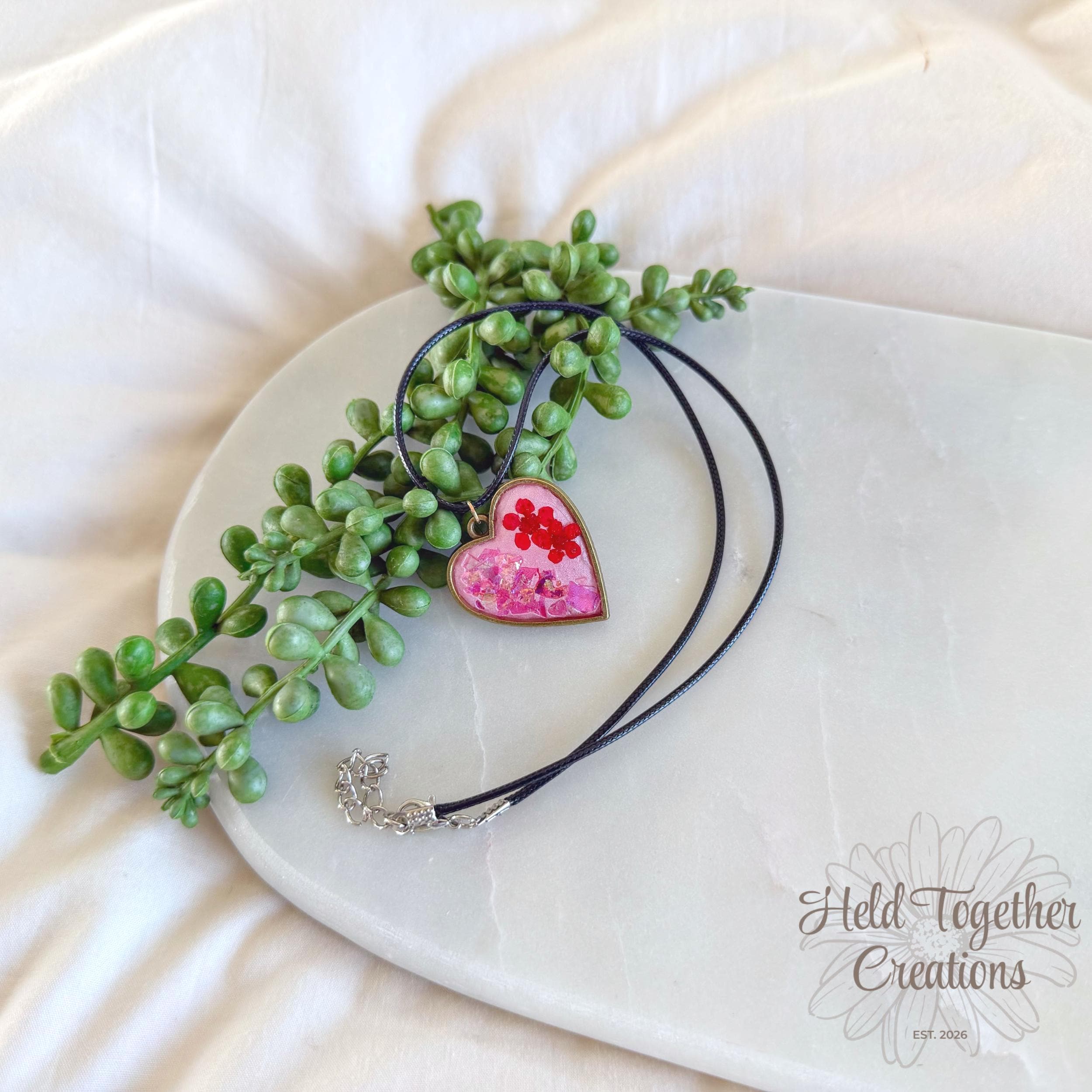 A delicate resin heart necklace featuring real dried florals and soft pink tones, the perfect meaningful piece for everyday wear or a thoughtful gift.